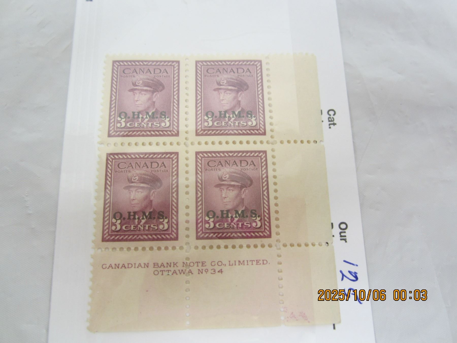 Canadian Corner Block of 3 Cent Wartime Marked OHMS MNH OG Never Used