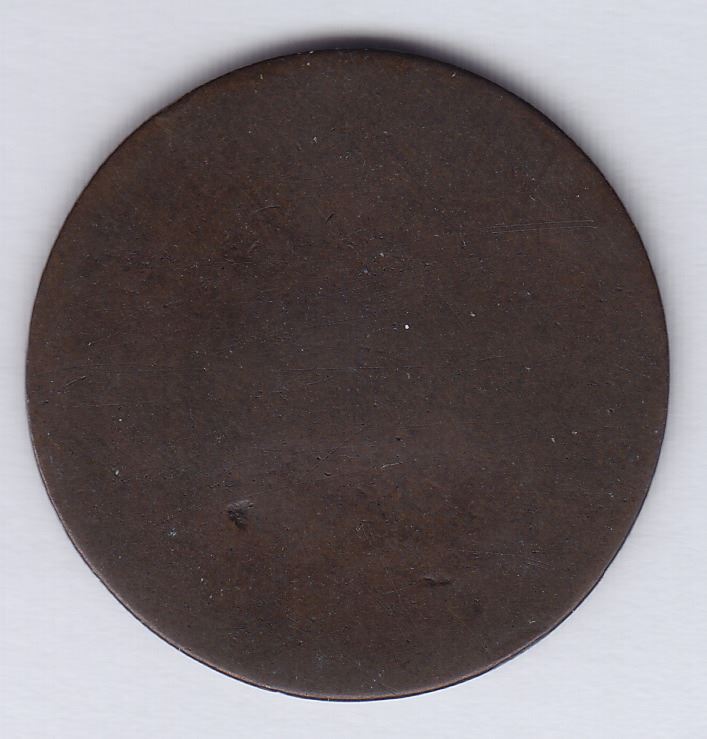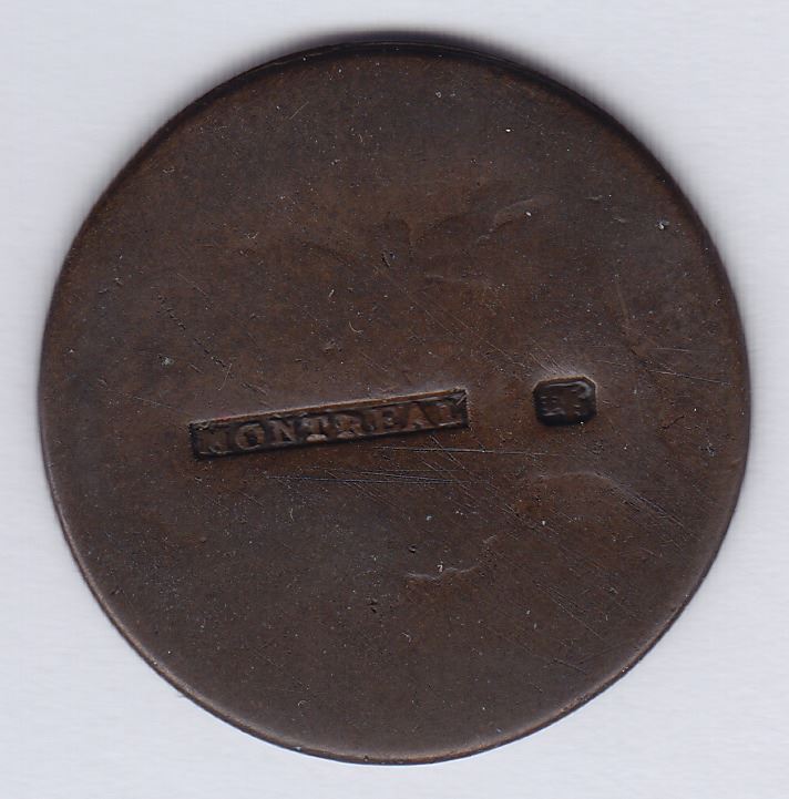MONTREAL and F(?) B each within rectangular cartouches on obv. of counterfeit Great Britain George III ½ penny (M.I. 660).
