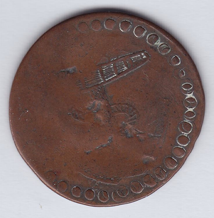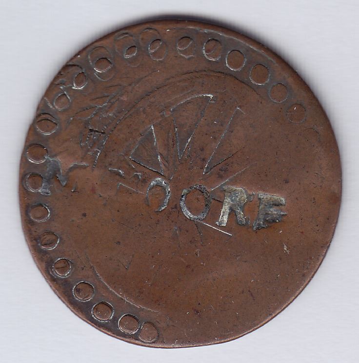 M MOORE on obv. of Blacksmith copper, Wood 32 (M.I. 663, cf. Brunk M-847). A great piece!