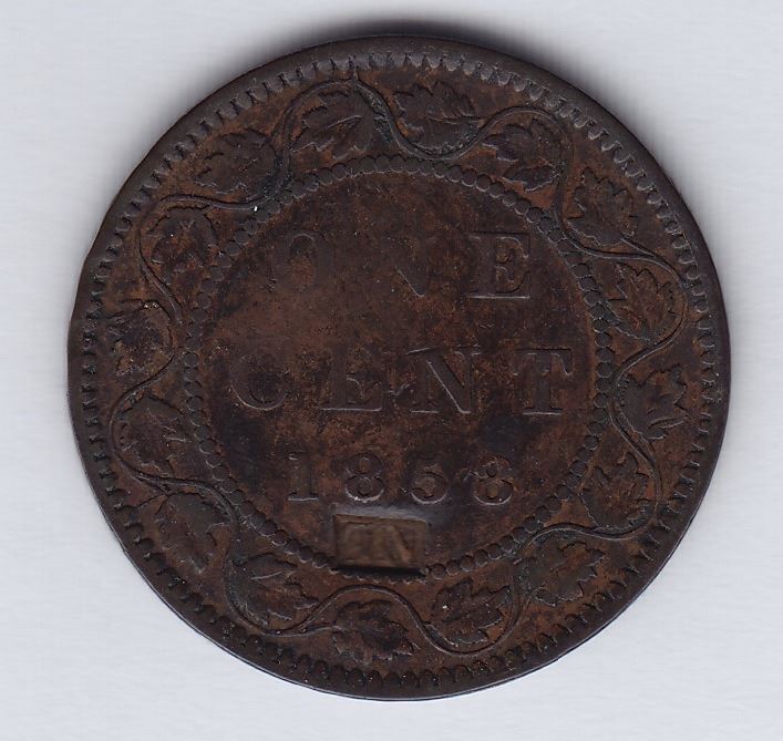 NL within rectangular cartouche on rev. of Province of Canada cent, 1858.