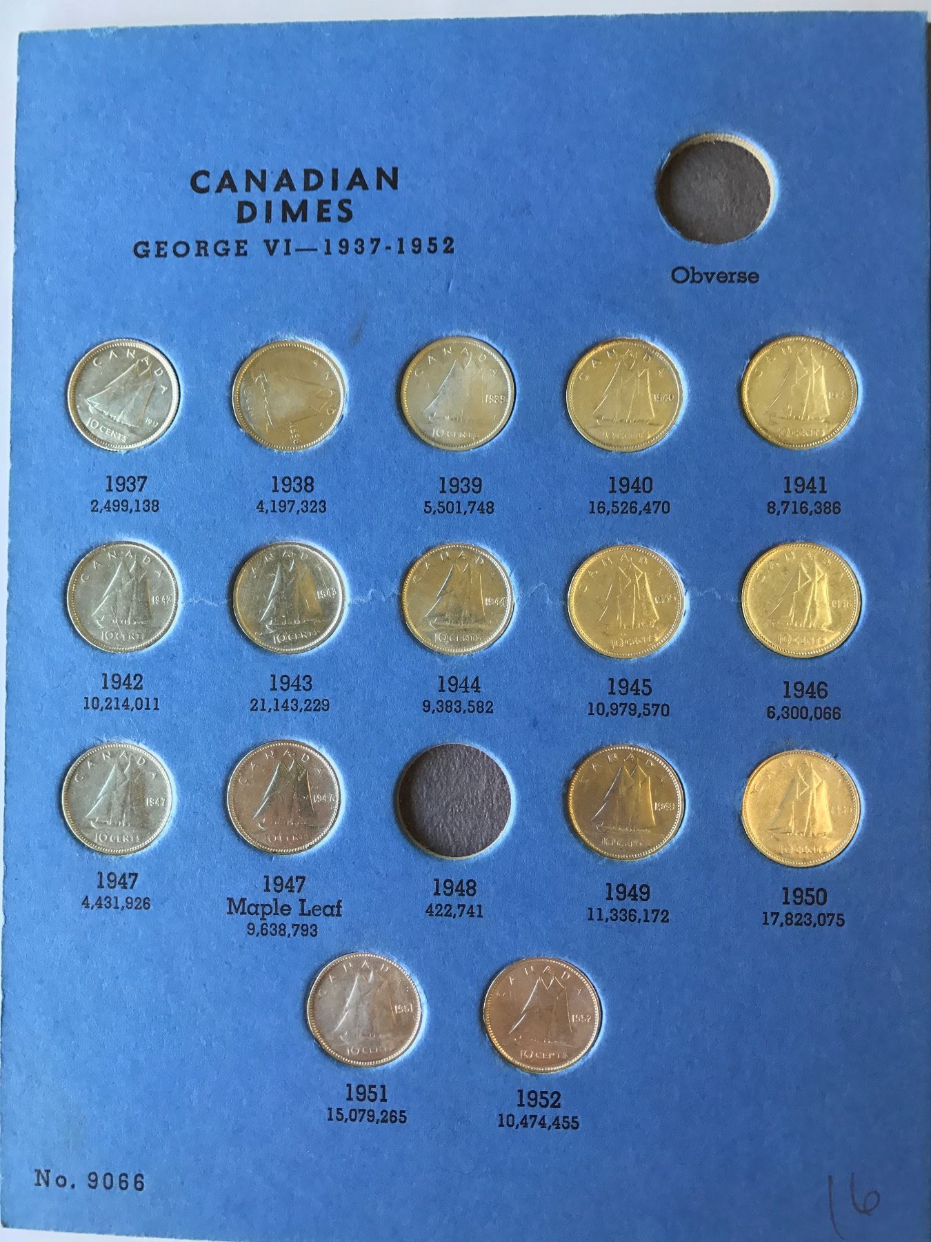 Canadian Dime Collection from 1937 to 1974. Lot of 36 coins