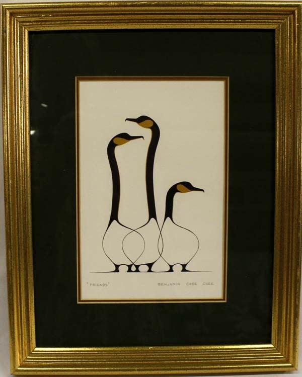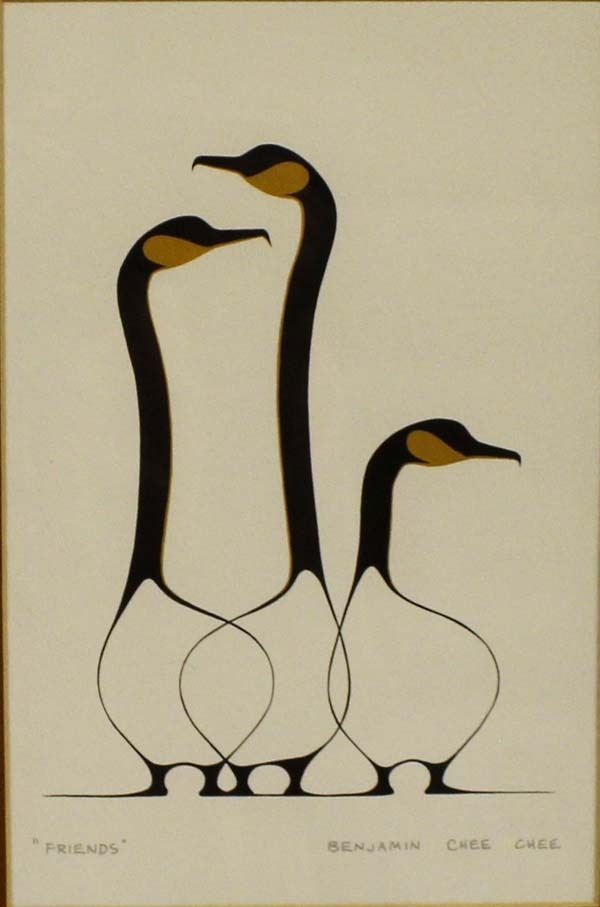 Native American Canadian First Nations Print ''Friends'' by Benjamin Chee Chee, visual measures 6'' x 9'' and has a total measurement of 14'' x 12'', gold gilt frame, under glass, and double matted, FYI: ''Kenneth Thomas Chee Chee (March 26, 1944 - March 11, 1977), known as Benjamin Chee Chee, was a Canadian artist of Ojibwa descent. He was born in Temagami, Ontario. Chee Chee's early life was troubled and he lost track of his mother, whom he spent many years searching for. He gained fame as he developed his unique style of clear graceful lines and minimal colour, depicting birds and animals. After finding his mother and achieving success as an artist, Chee Chee died by suicide in an Ottawa in 1977.''