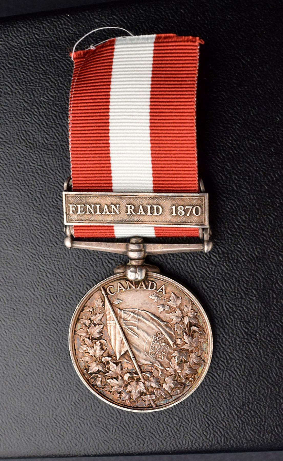 The Canadian General Service medal with one clap "Fenian Raid 1870". With ribbon. Belonged to "TR. R. Smith, 1 st. Que. (Quebec) Cav. (Cavalry)". Catalogue $400 cdn