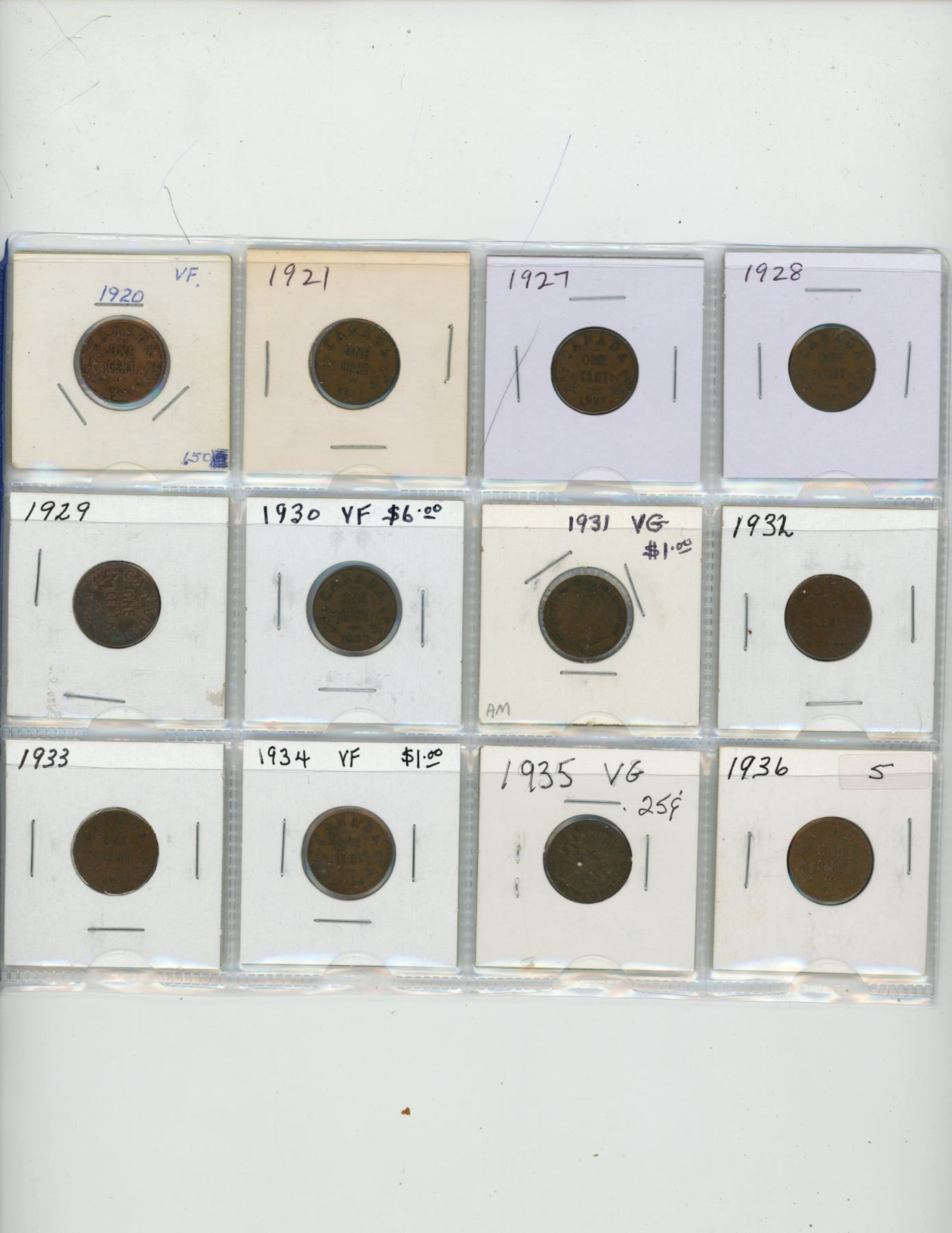 Canadian George V Small Cent Collection. 12-coin set includes 1920, 1921, 1927, 1928, 1929, 1930, 1931, 1932, 1933, 1934, 1935, & 1936.