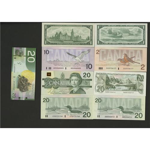 <B>Canadian Grouping including</B></I> $1 BC-37bA-i *BM; 45bA-i *BM; $2 BC-55c-i EGS; $10 BC-57a ADG; $20 BC-54bA-i engraved; 58b-ii EVC no BPN; 58b-i AWB; 58d EYD; and 64a-i EYJ. All of the notes grade <B>Choice Crisp Uncirculated</B></I> or better.
