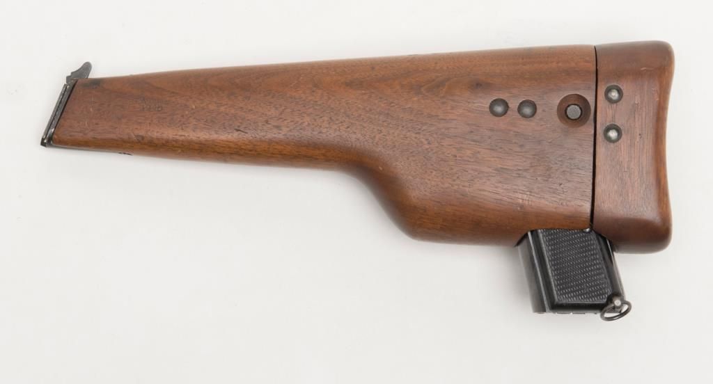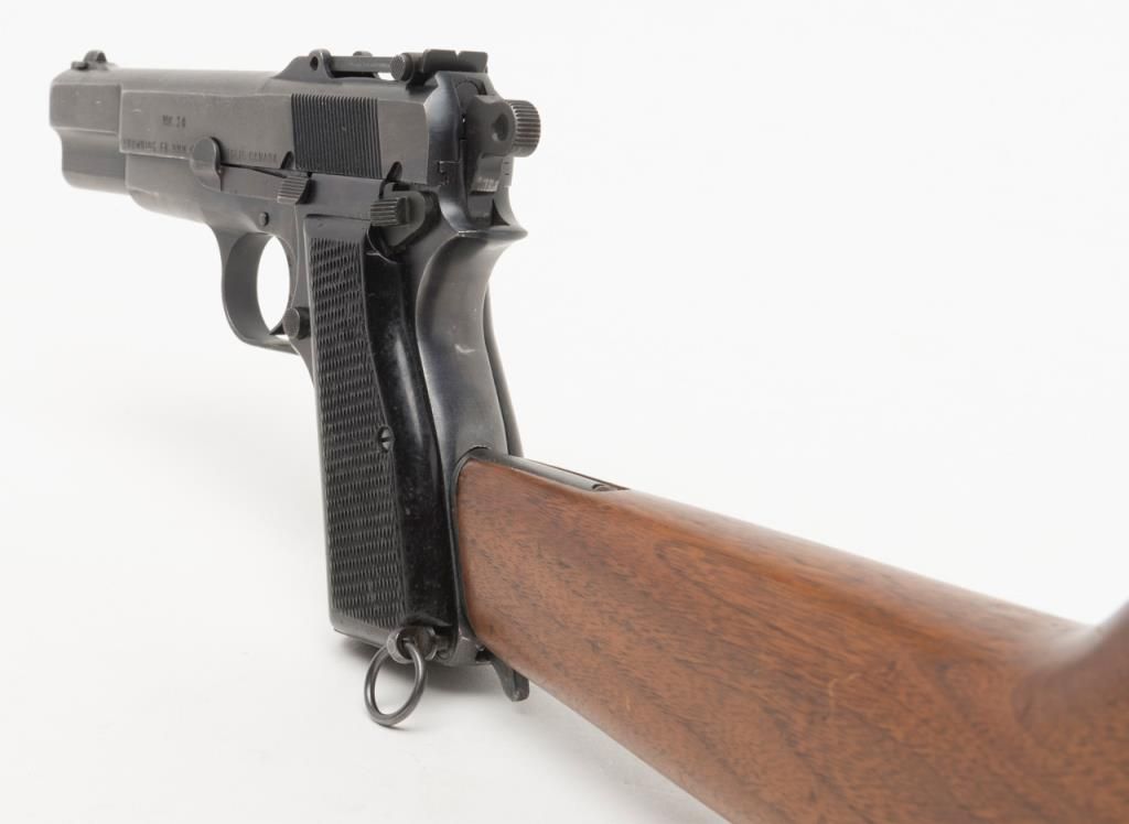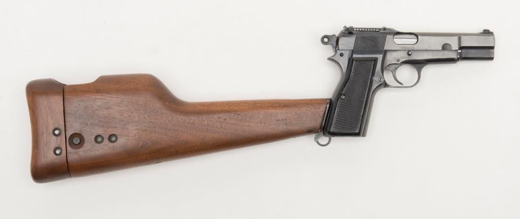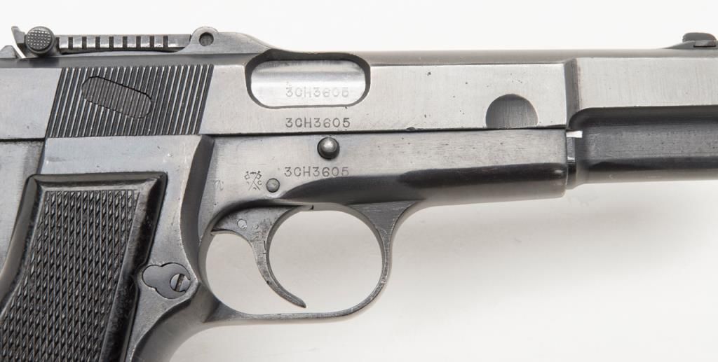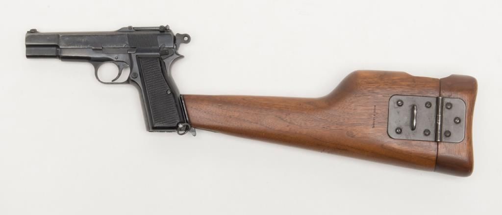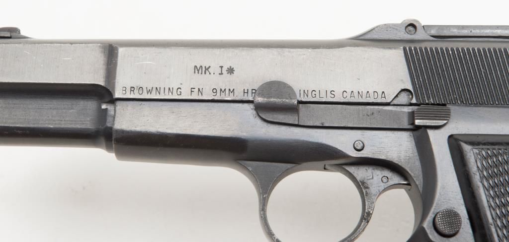 Canadian Inglis MK I* Hi-Power with shoulder stock holster, #3CH3605, 9mm, 4 5/8" barrel, tangent sights, blued finish, lanyard loop, with black plastic checkered grips. Pistol is in fine condition overall, showing 95-98% original finish, with thinning at the muzzle and high points, and several minor scratches. Bore is near excellent, action is crisp, sights graduated from 50-500. Wooden stock is in fine to excellent condition, showing minor dings and scratches from storage.Stock is marked "S.A. LTD. 1945" on right side and "Made in Canada" on the left (if mounted to gun). A very nice Inglis with no import marks. Est. $800-1600 Revolver remains in fine condition overall, showing 95-98% original finish, thinningat the muzzle and high points, showing a drag line on the cylinder. Bore is bright, action is very good with good lock up. Grips are very good to fine with minor losses at the edges. GHS inspectors mark on the left side of the frame.Hard to improve upon. (C&R / PPT) Est. $600-1200.