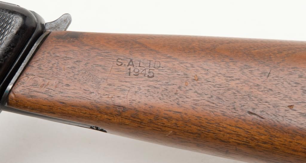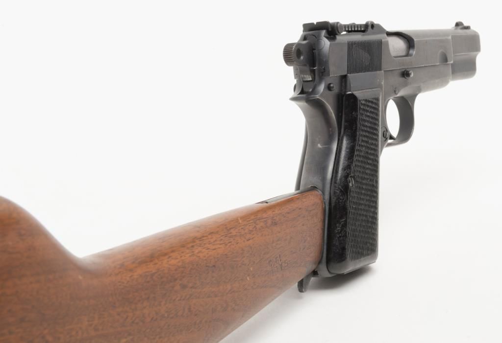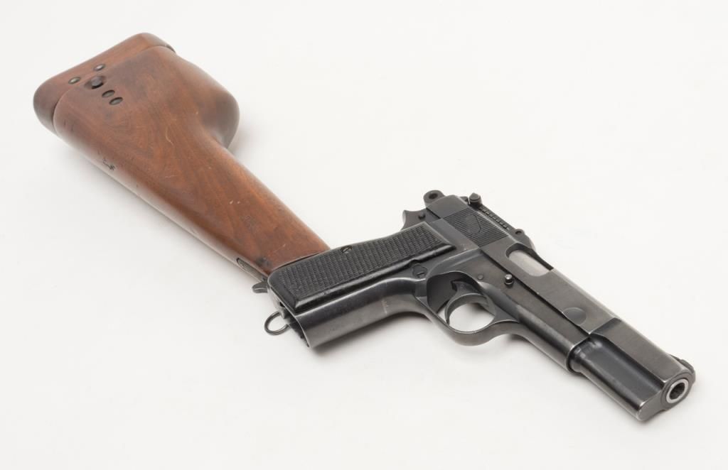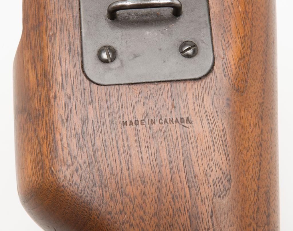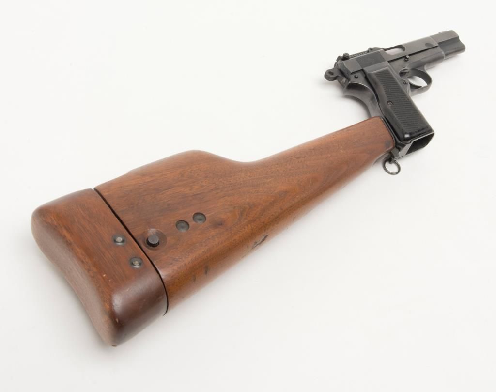Canadian Inglis MK I* Hi-Power with shoulder stock holster, #3CH3605, 9mm, 4 5/8" barrel, tangent sights, blued finish, lanyard loop, with black plastic checkered grips. Pistol is in fine condition overall, showing 95-98% original finish, with thinning at the muzzle and high points, and several minor scratches. Bore is near excellent, action is crisp, sights graduated from 50-500. Wooden stock is in fine to excellent condition, showing minor dings and scratches from storage.Stock is marked "S.A. LTD. 1945" on right side and "Made in Canada" on the left (if mounted to gun). A very nice Inglis with no import marks. Est. $800-1600 Revolver remains in fine condition overall, showing 95-98% original finish, thinningat the muzzle and high points, showing a drag line on the cylinder. Bore is bright, action is very good with good lock up. Grips are very good to fine with minor losses at the edges. GHS inspectors mark on the left side of the frame.Hard to improve upon. (C&R / PPT) Est. $600-1200.