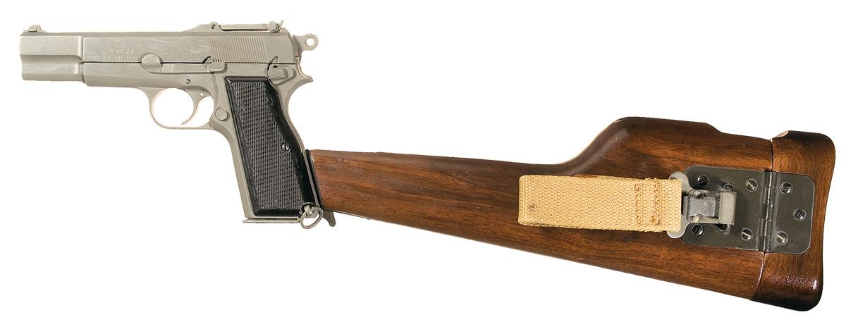 Tangent rear sight and grooved backstrap, with the two line model and address markings on the left side of the slide and matching stacked numbers on the barrel, slide and frame. A matching number is also stamped on the magazine. Fitted with a pair of checkered grips and a wood shoulder stock holster, marked "S.A. LTD/ 1945" near the mounting hardware and "MADE IN CANADA" below the hanging staple, which has a detachable canvas belt loop.