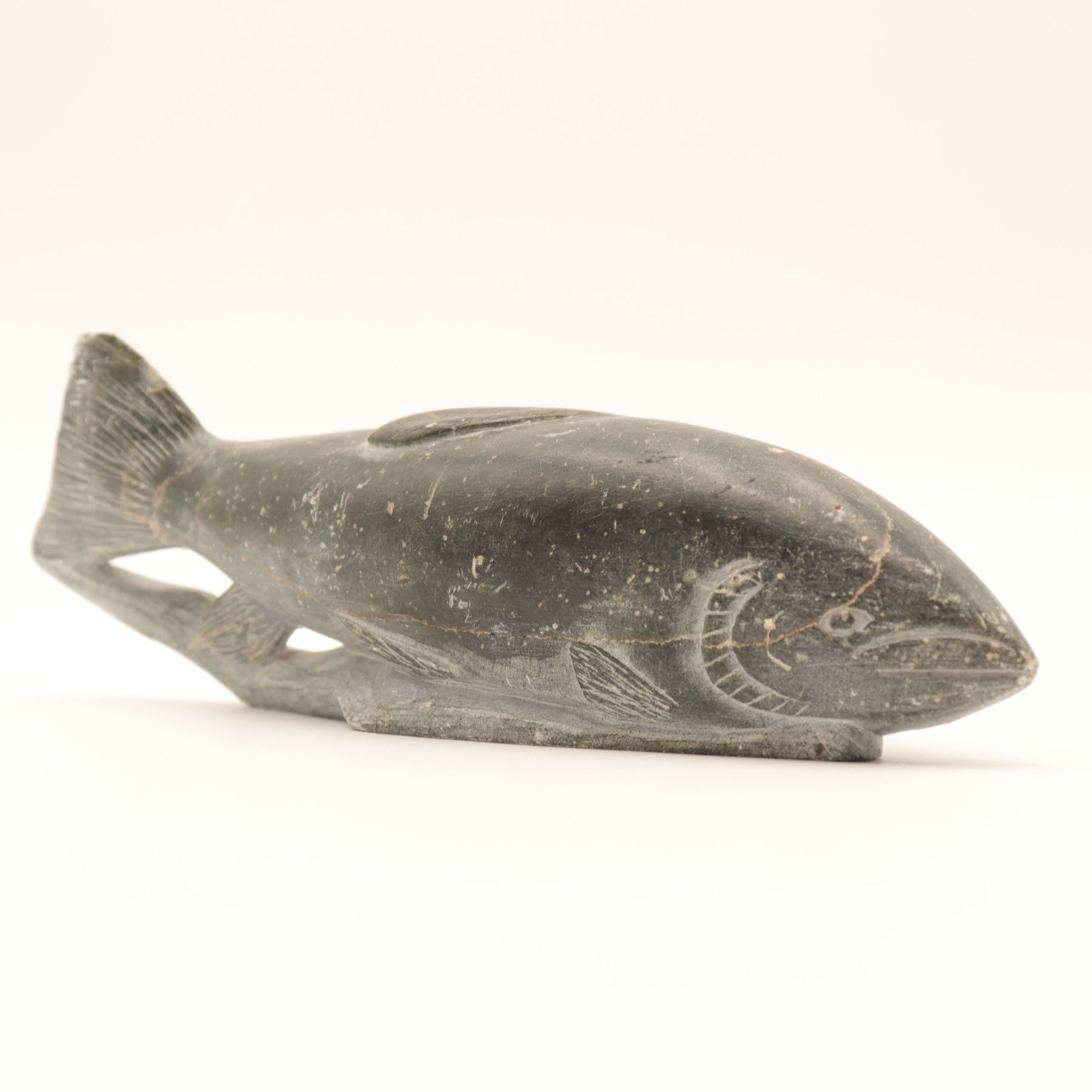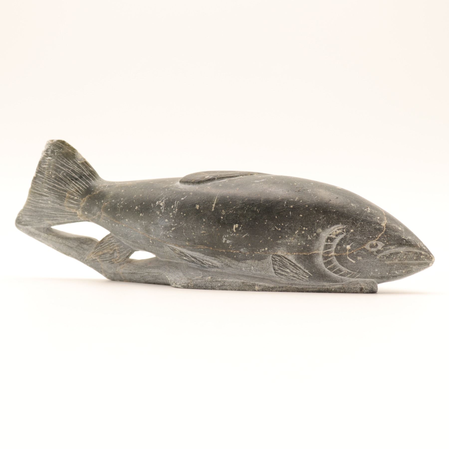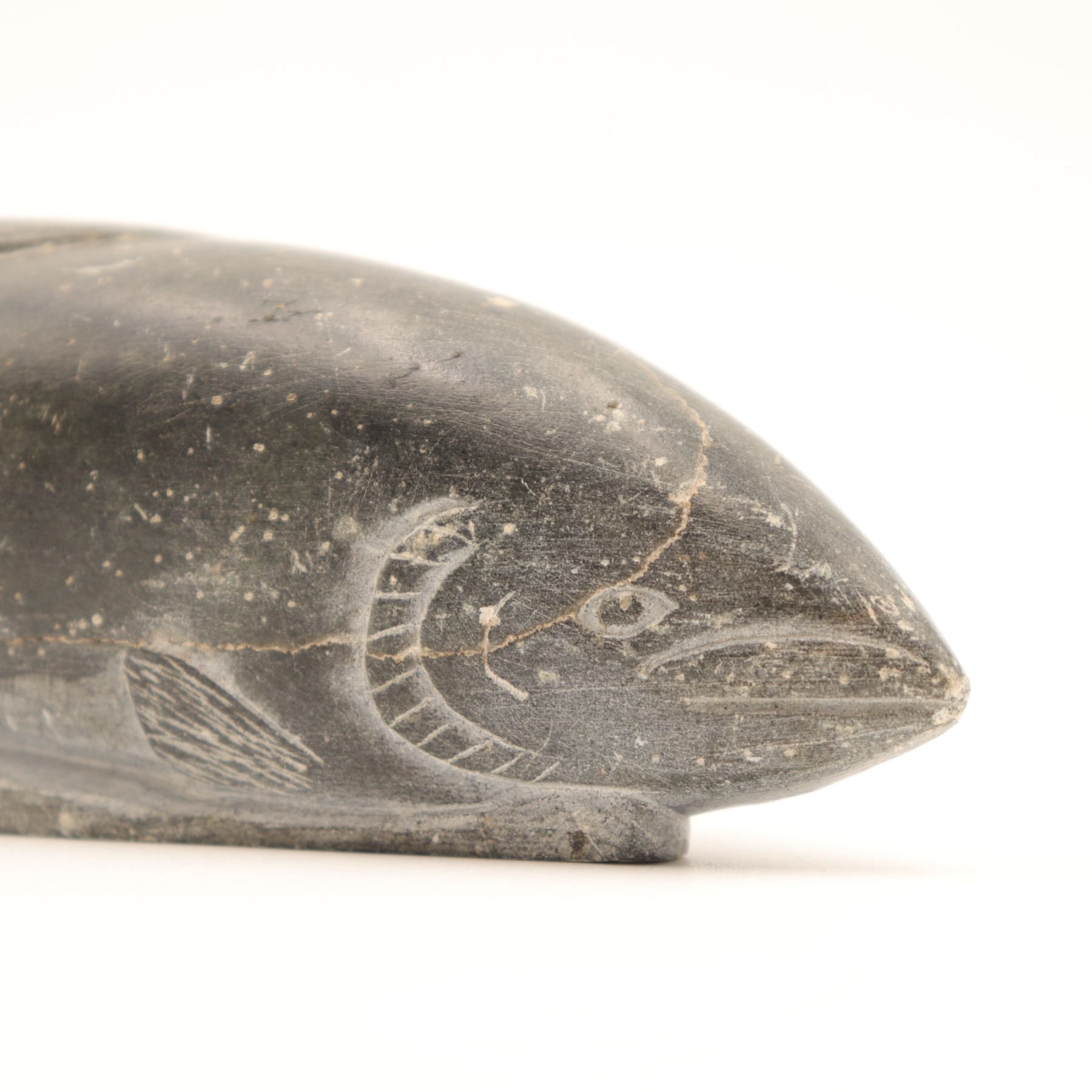 A Canadian Inuit carved stone fish sculpture, likely representing an Arctic char, worked in grey stone with a smoothly rounded body, raised dorsal fin, incised gill and fin detailing, and an openwork tail support carved from the same piece. The underside bears a faint incised signature including the surname element “ISAPIK (?),” though the inscription is not sufficiently legible to support a secure artist attribution. A compact and appealing wildlife carving with a strong horizontal silhouette and restrained surface finishing. Surface wear, scattered scratches, visible stone lines across the head and body, and minor edge nicking to the tail fin.