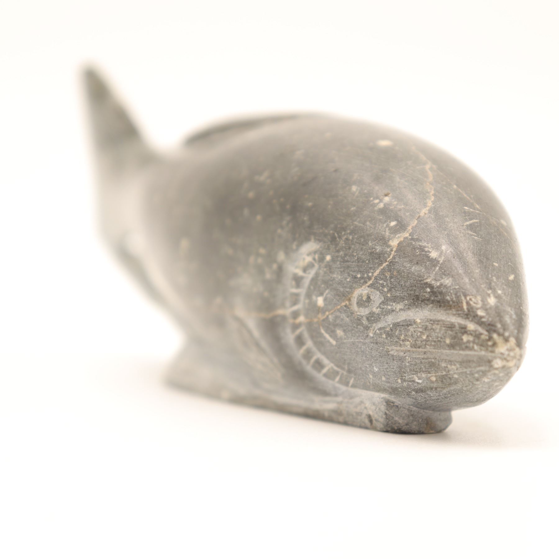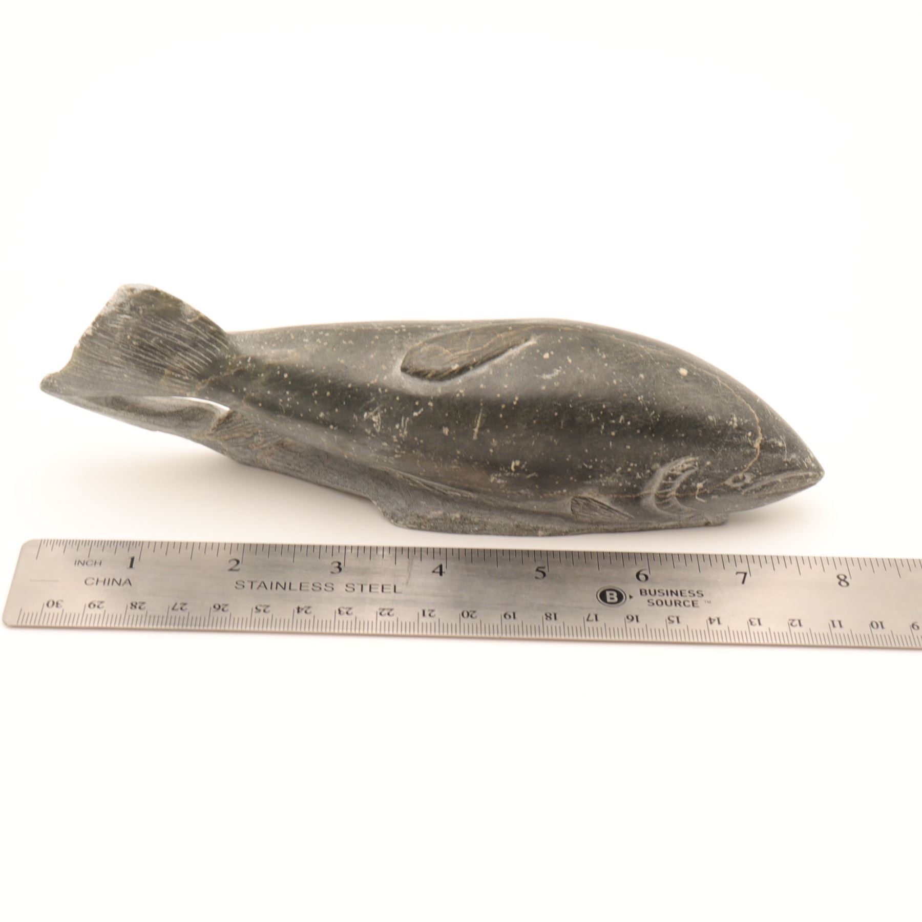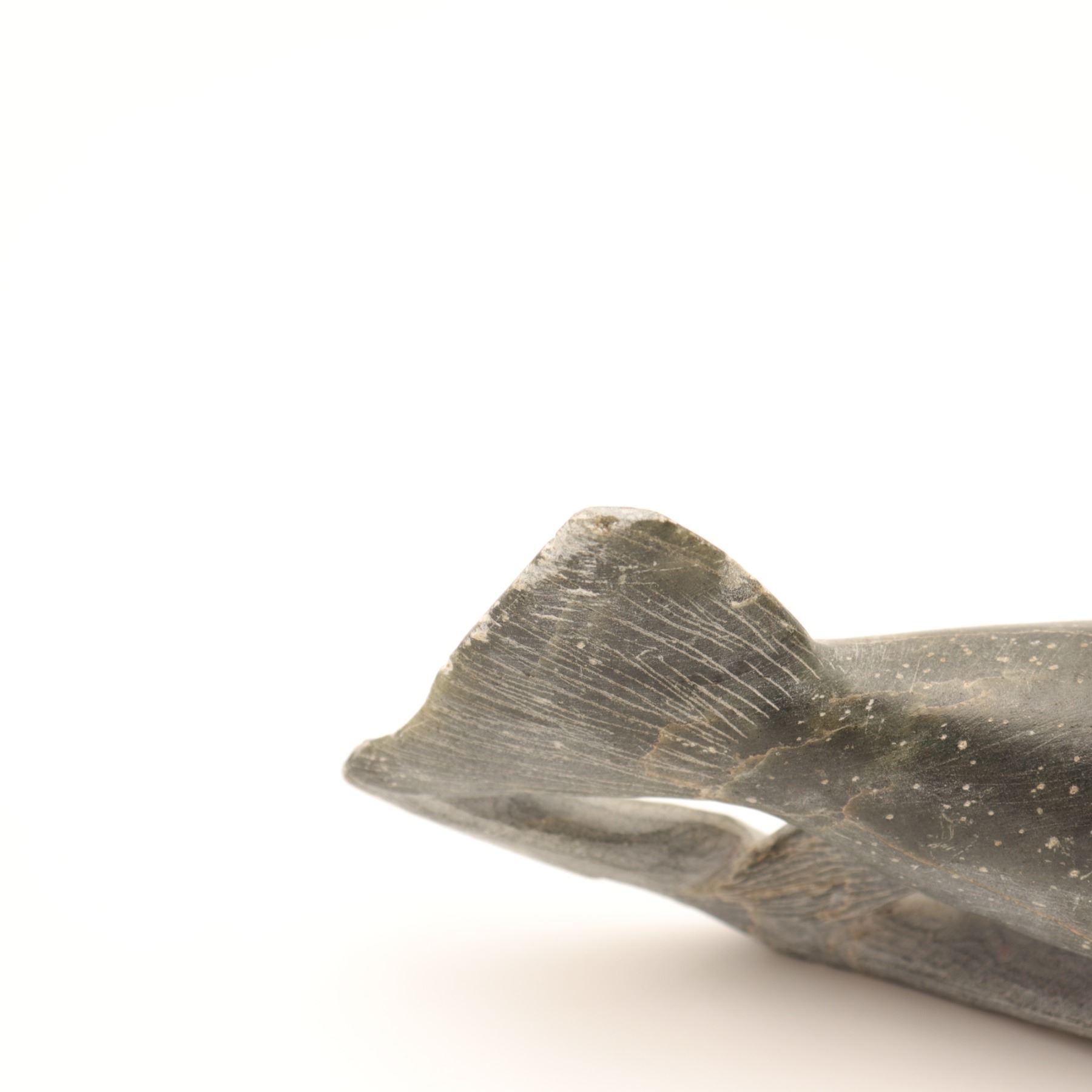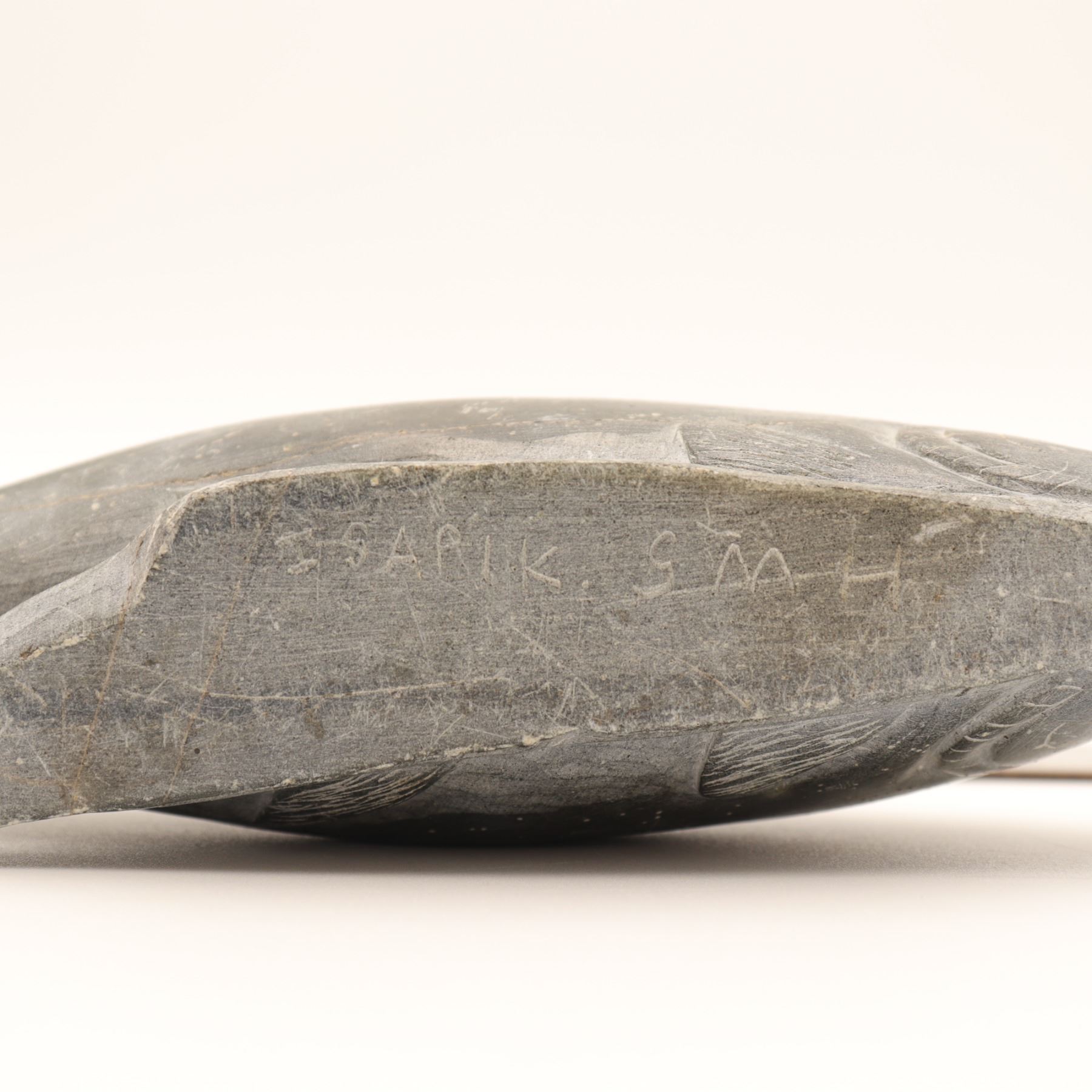 A Canadian Inuit carved stone fish sculpture, likely representing an Arctic char, worked in grey stone with a smoothly rounded body, raised dorsal fin, incised gill and fin detailing, and an openwork tail support carved from the same piece. The underside bears a faint incised signature including the surname element “ISAPIK (?),” though the inscription is not sufficiently legible to support a secure artist attribution. A compact and appealing wildlife carving with a strong horizontal silhouette and restrained surface finishing. Surface wear, scattered scratches, visible stone lines across the head and body, and minor edge nicking to the tail fin.