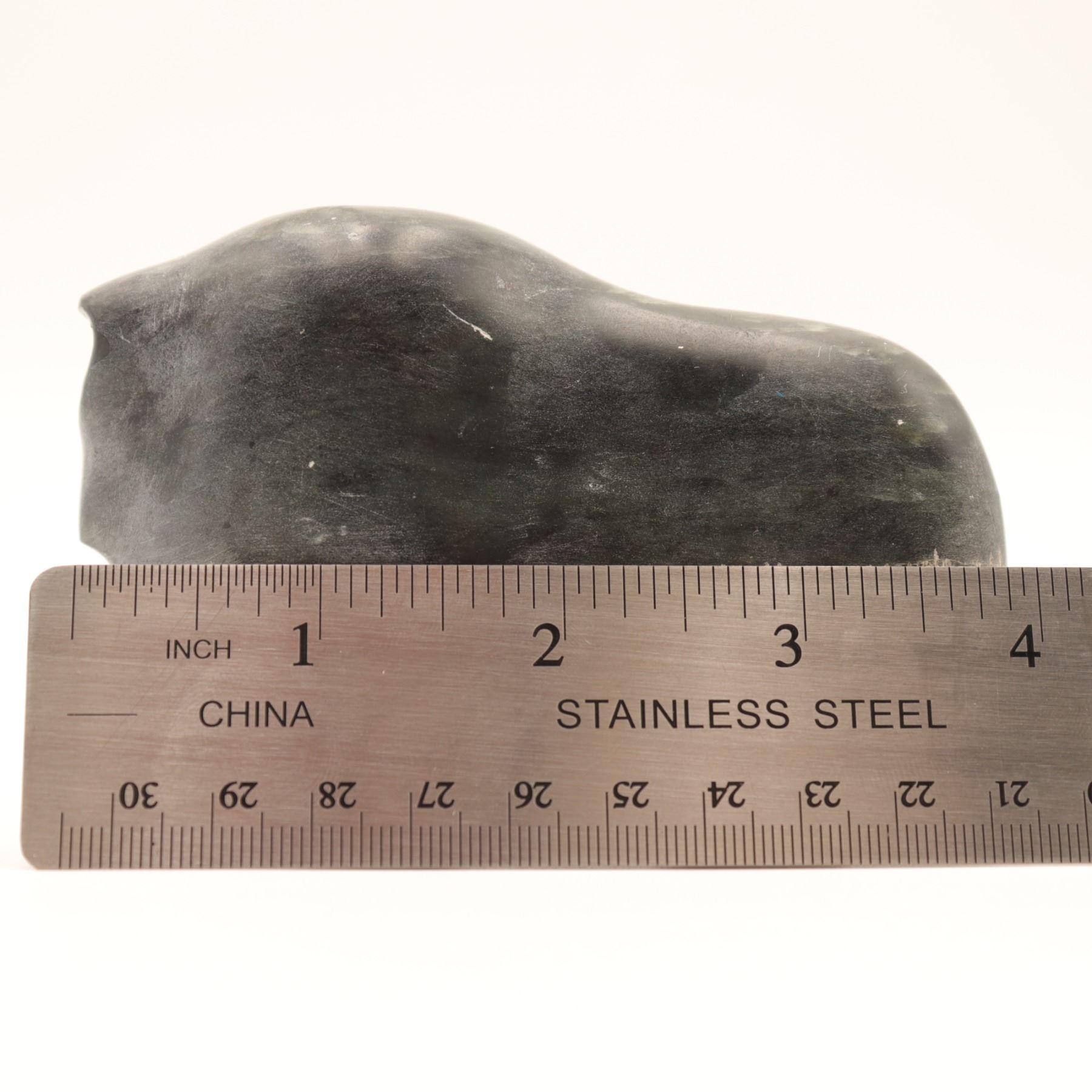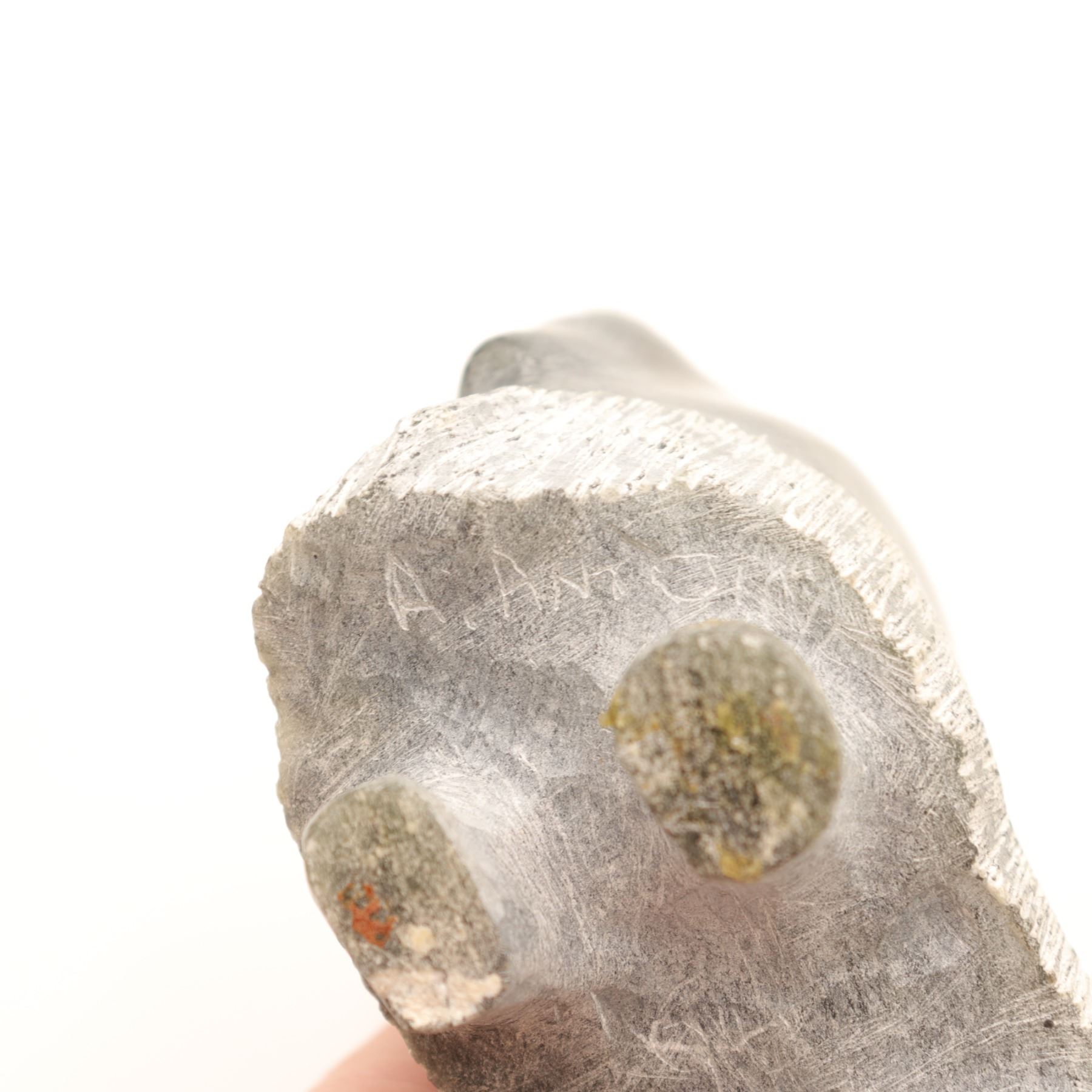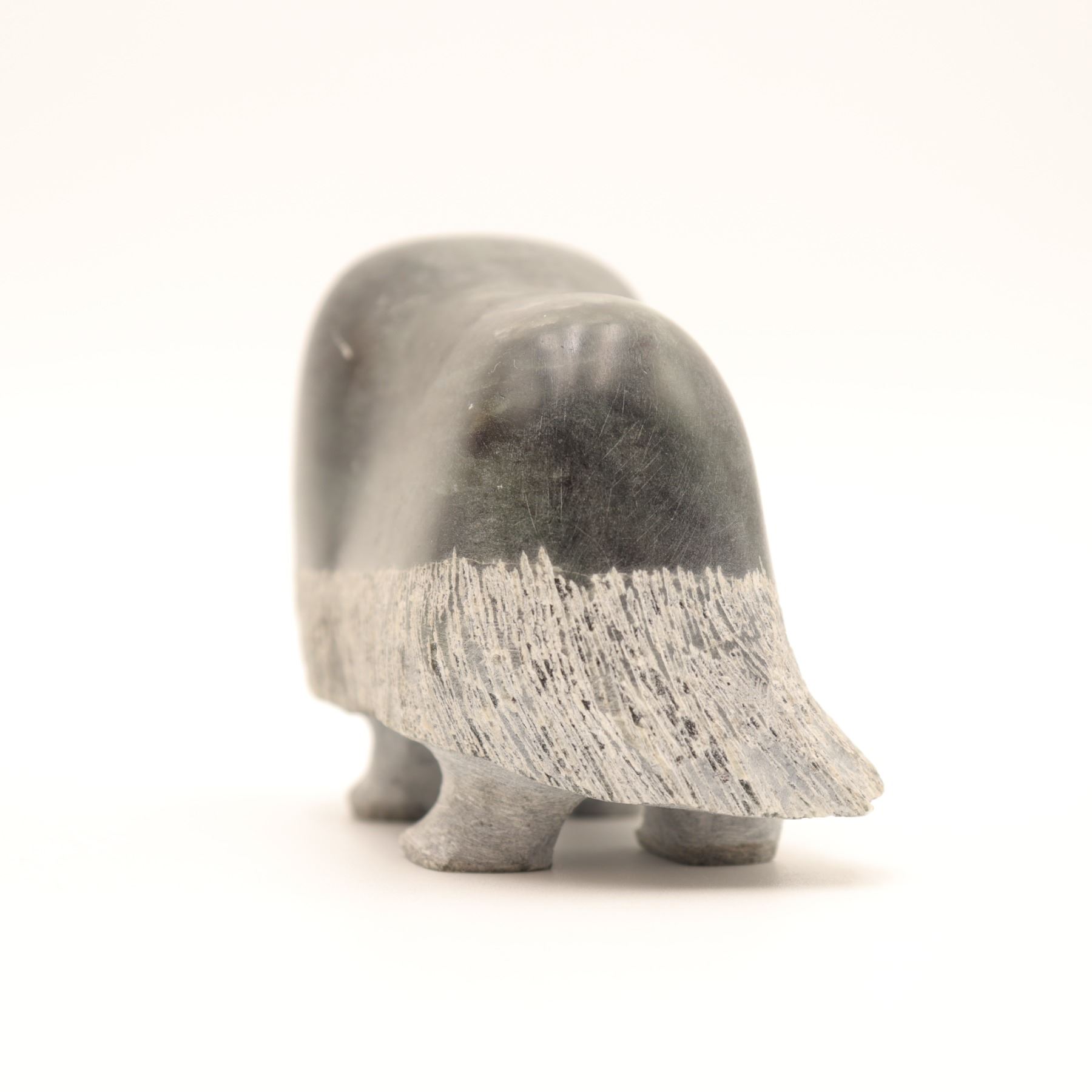A Canadian Inuit carved stone muskox figure, worked in a dark green-gray stone with a compact, stylized body, rounded hump, and a contrasting band of incised rough-textured coat encircling the lower half. The carving is notable for its reductive silhouette and effective contrast between the smoothly polished upper body and the shaggy treatment of the fleece, a familiar visual language in Inuit muskox sculpture. The underside bears a faint incised signature that is not sufficiently legible to support a secure artist attribution. A small but appealing northern animal carving with strong decorative presence. Light surface wear and scuffing; underside with old felt pads.