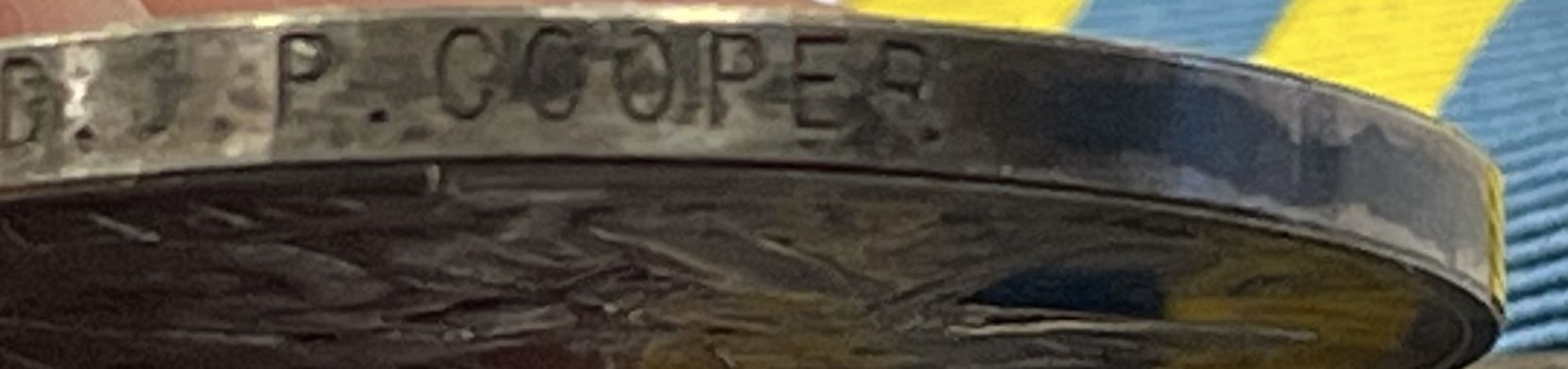 In Silver with piece of replacement ribbon. Impressed along edge: SA-2824 D.J.P. COOPER. No other research completed. Full size.