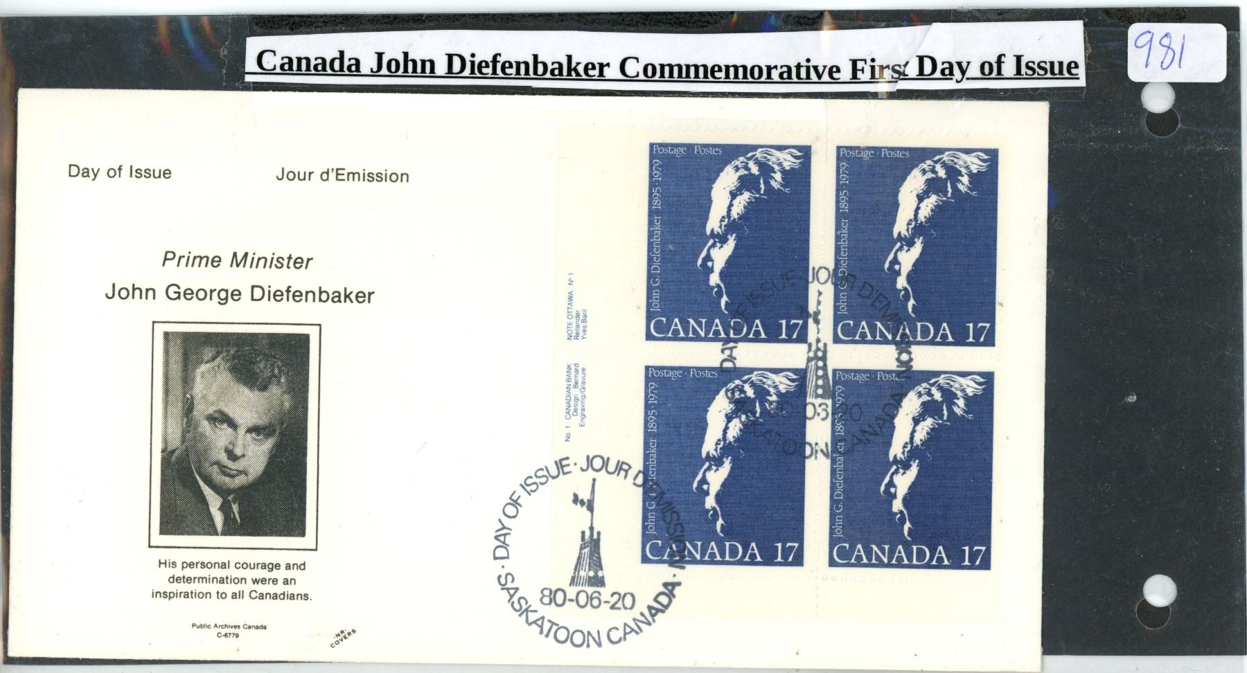 Canadian, John Diefenbaker Commemorative First day issue