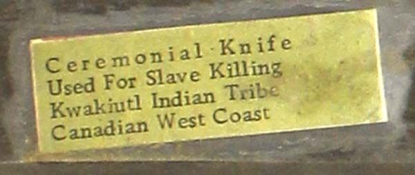 Canadian West Coast Kwakiutl Pottery Knife Replica by Philip Thorn, measures 3'' x 13.5'' x 1.5'', original gold foil labels on back, chipping on nose and top lip