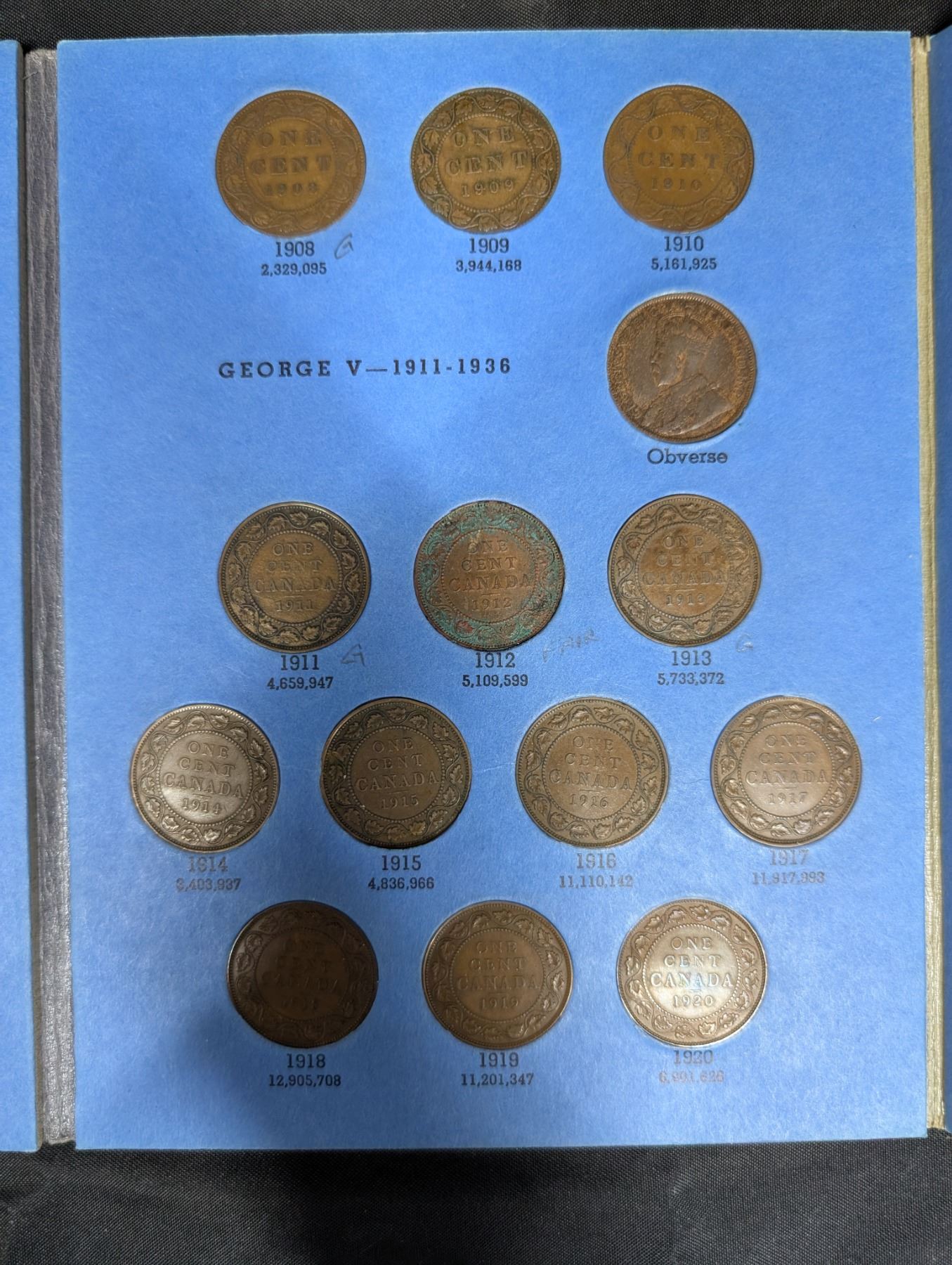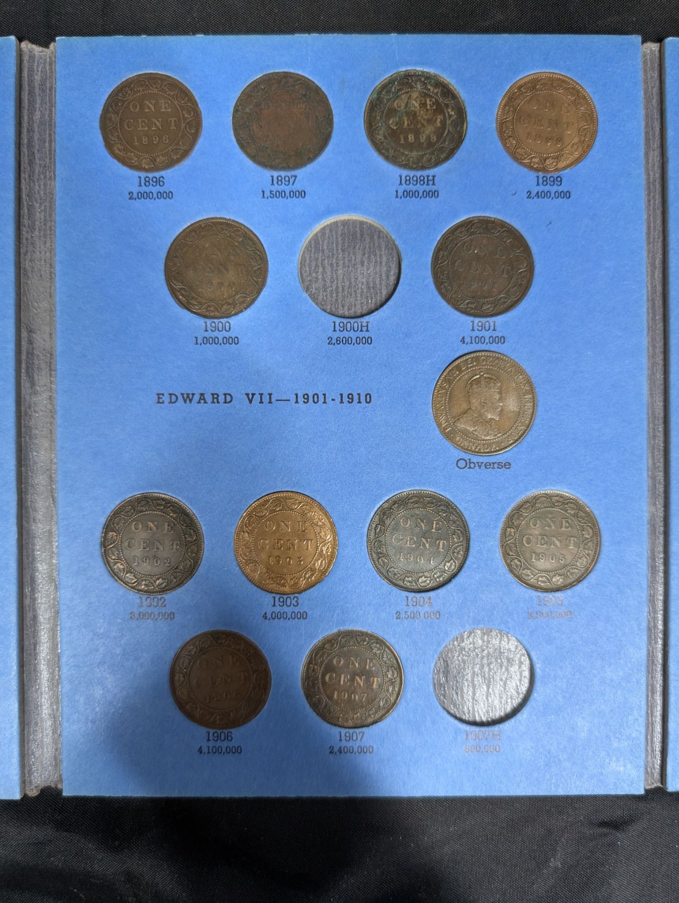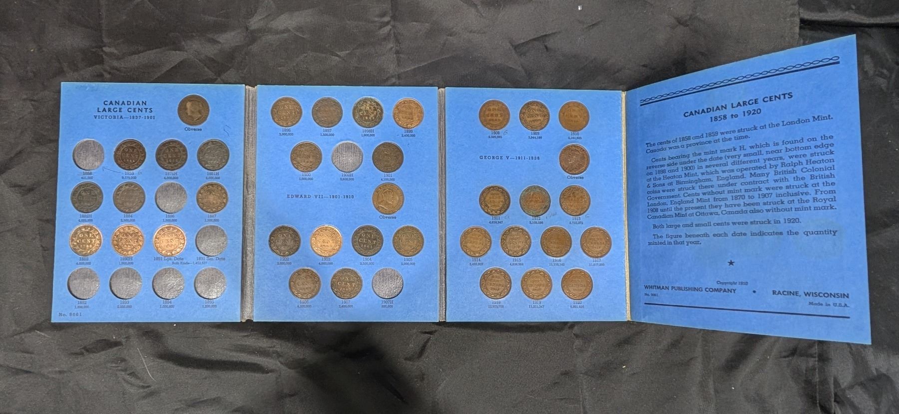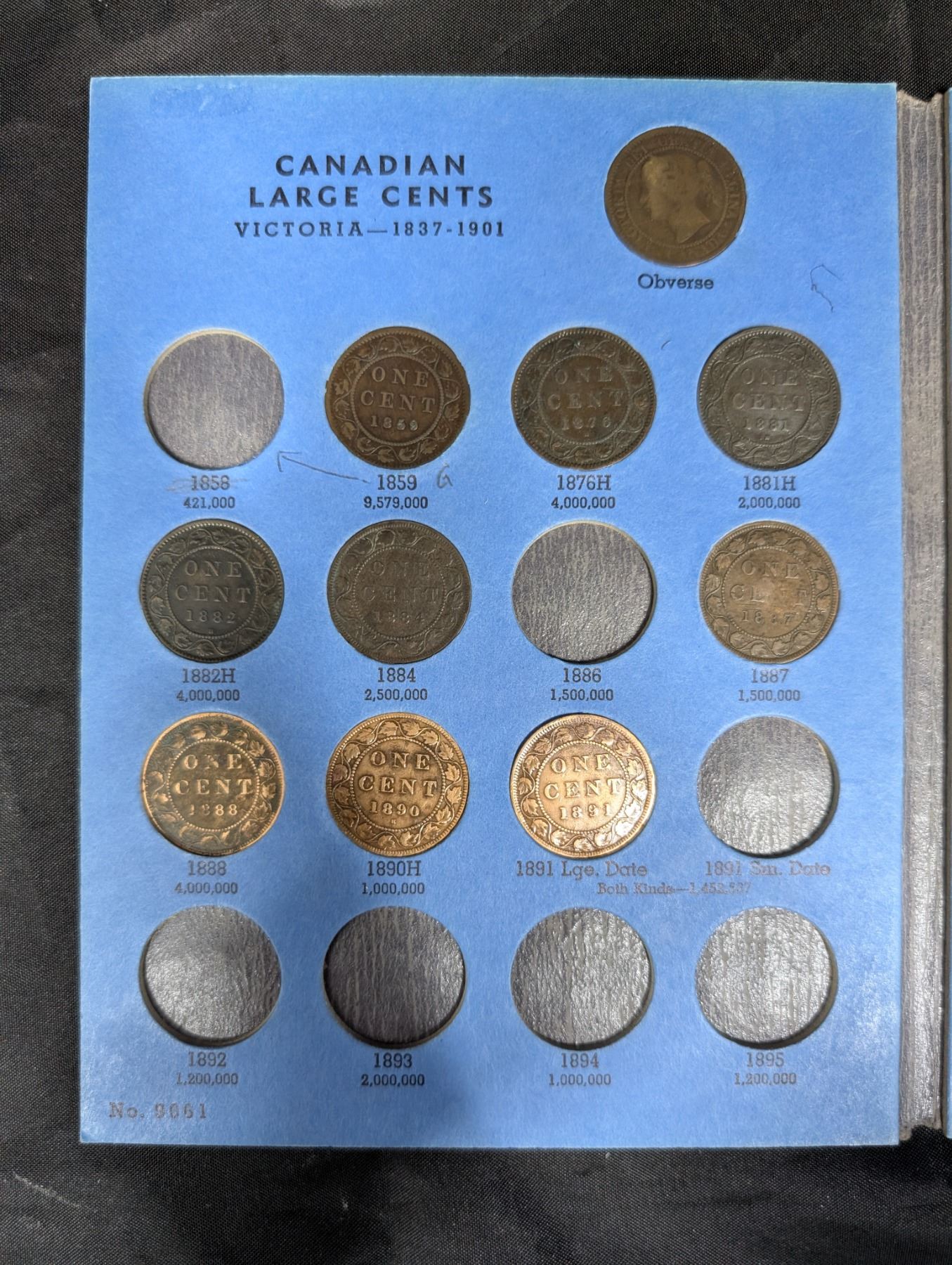 Canadian Large Cent Collection containing 37 Canadian Large Cents from 1859 to 1920. Missing only 9 coins. Housed in a blue Whitman folder.