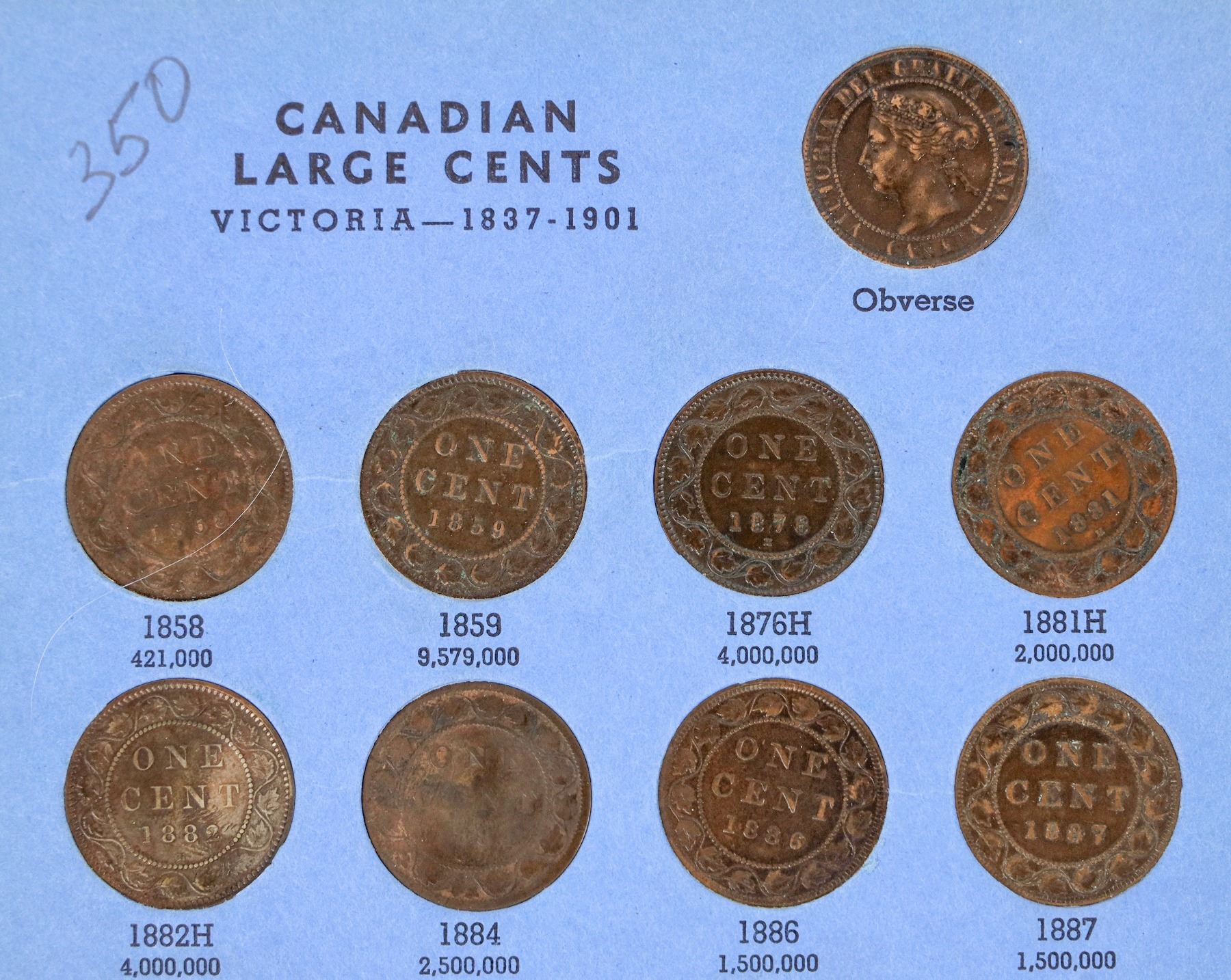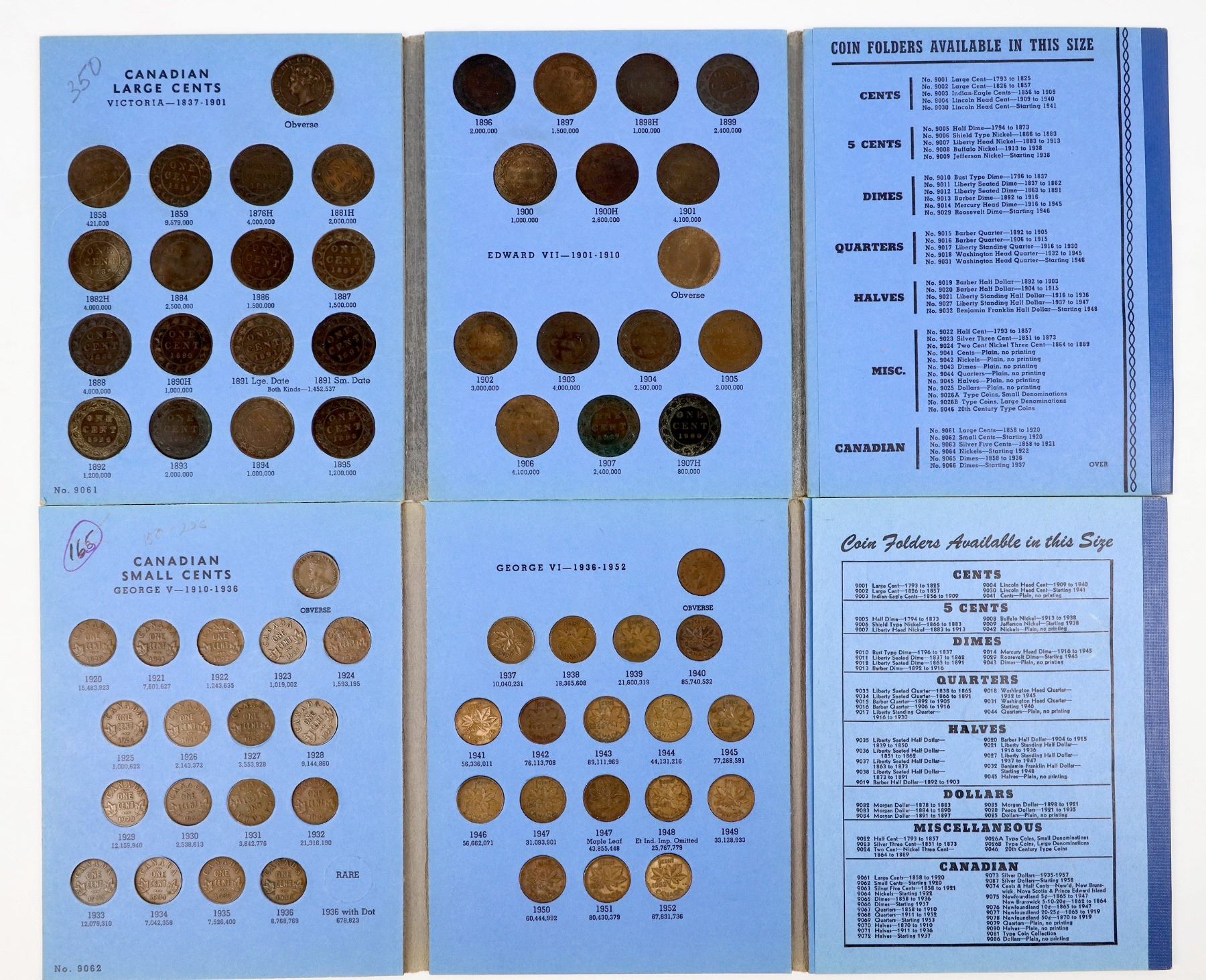 Two blue Whitman coin albums: 1) No. 9061: Canadian Large Cent Collection 1858-1920; complete with 46 coins; nice condition, VF-EF mostly. 2) No. 9062: Canadian Small Cent Collection 1920 to date, with 56 coins up to 1971. Later coins brilliant uncirculated, earlier G-EF condition.