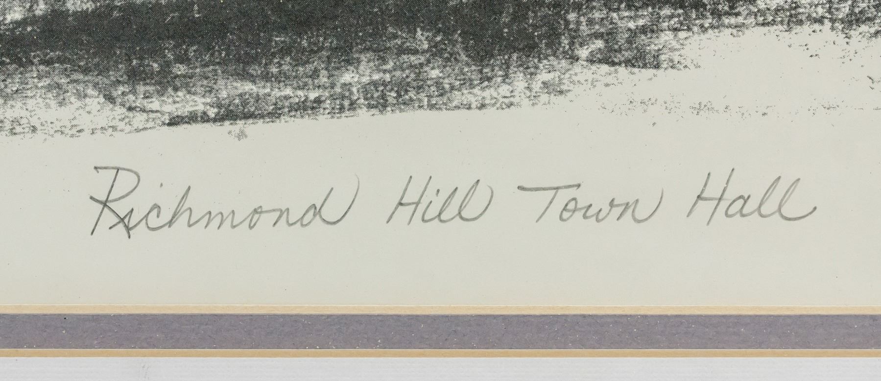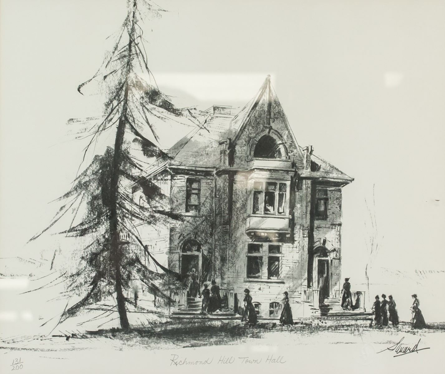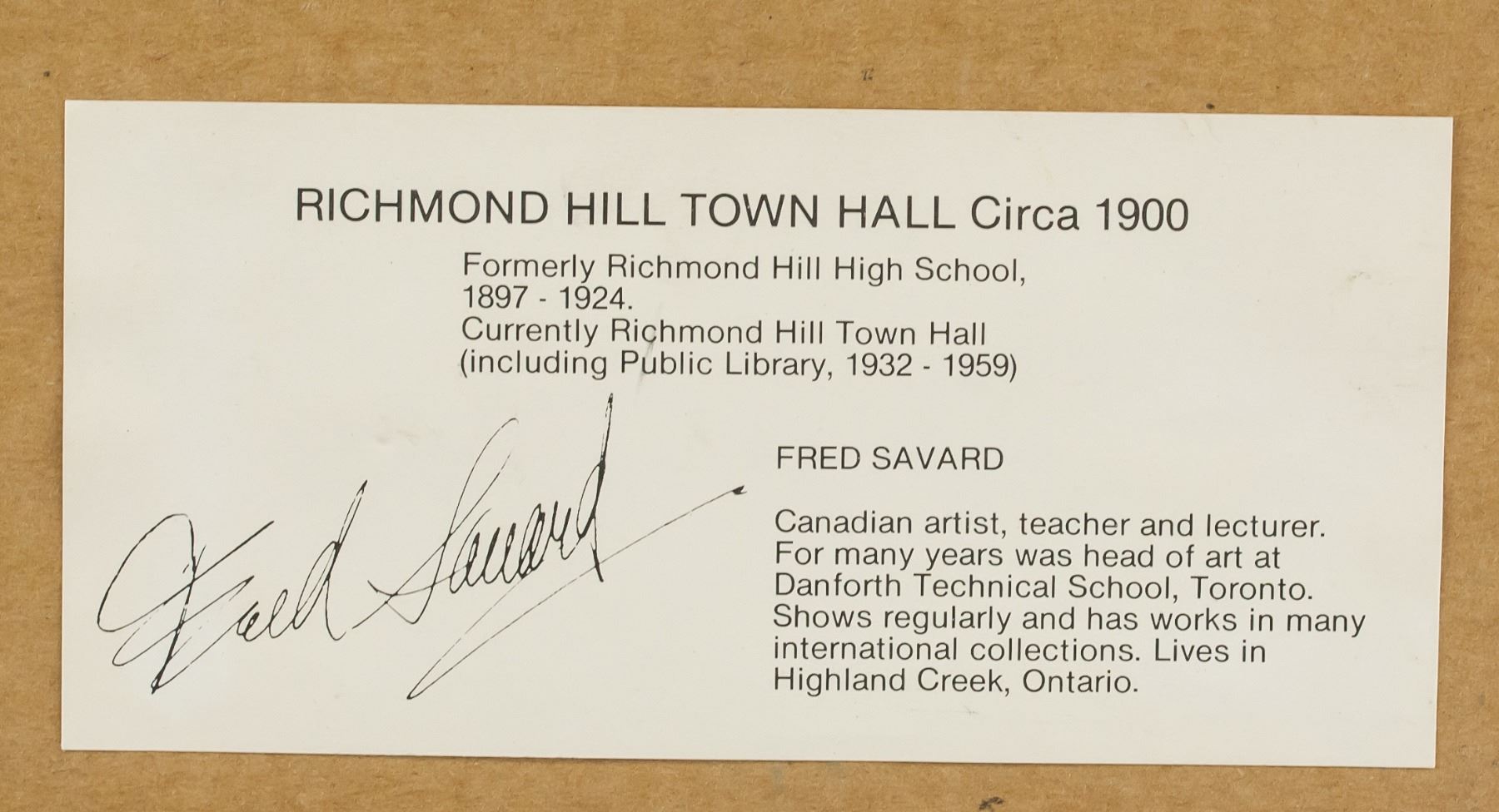 Print on paper, framed. Featuring two-storey building with women dressed in black moving around it and a large tree in the front yard. Signed "Savard" in the bottom right corner. "Richmond Hill Town Hall" inscribed beneath image. "131/200" inscribed on the bottom left corner. Sticker affixed to verso reads "RICHMOND HILL TOWN HALL Circa 1900 Formerly Richmond Hill High School 1897-1924 Currently Richmond Hill Town Hall (including Public Library, 1932-1959) FRED SAVARD Canadian artist, teacher and lecturer. For many years, was head of art at Danforth Technical School, Toronto. Shows regularly and has works in many interntional collections. Lives in Highland Creek, Ontario." "Fred Savard" signed on left side of sticker. Newspaper clipping affixed to verso, date inscribed as "Toronto Sun - Sunday August 9th/1992". 34 x 40 cm (13.5 x 16 in, Frame: 49 x 55 cm (19 x 21.5 in)
