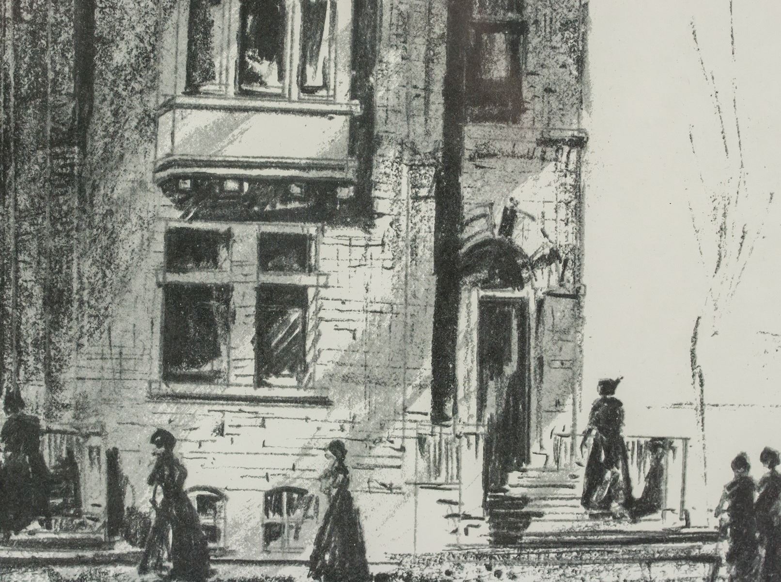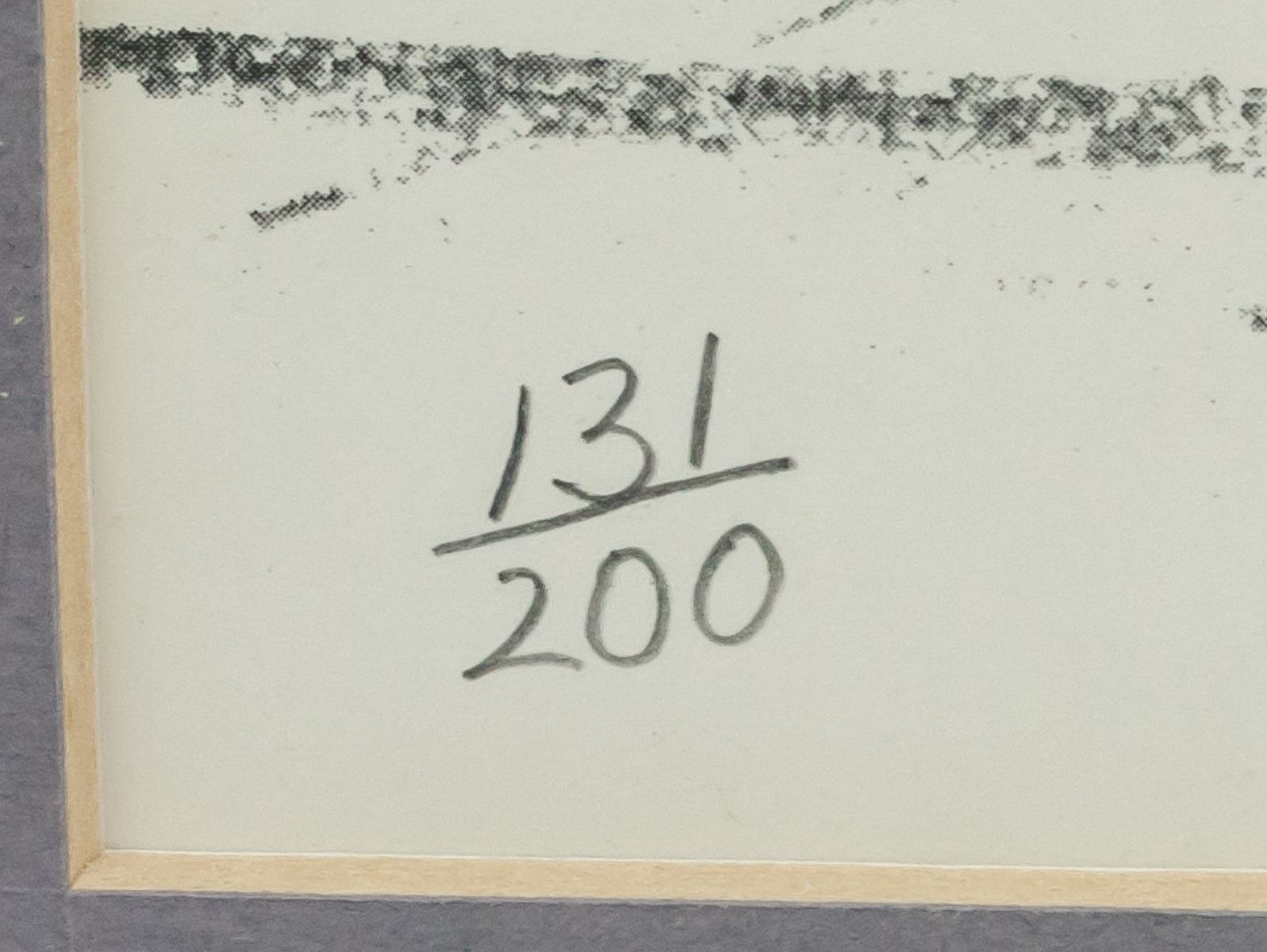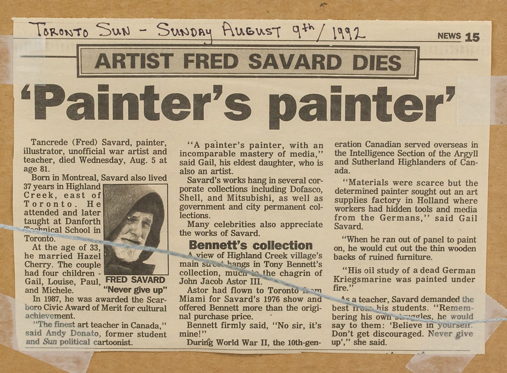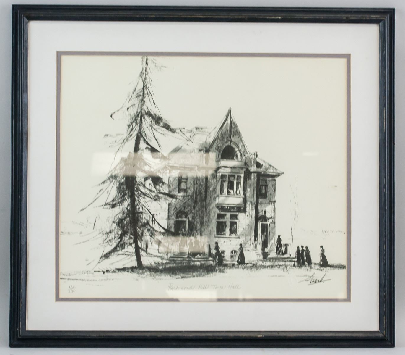Print on paper, framed. Featuring two-storey building with women dressed in black moving around it and a large tree in the front yard. Signed "Savard" in the bottom right corner. "Richmond Hill Town Hall" inscribed beneath image. "131/200" inscribed on the bottom left corner. Sticker affixed to verso reads "RICHMOND HILL TOWN HALL Circa 1900 Formerly Richmond Hill High School 1897-1924 Currently Richmond Hill Town Hall (including Public Library, 1932-1959) FRED SAVARD Canadian artist, teacher and lecturer. For many years, was head of art at Danforth Technical School, Toronto. Shows regularly and has works in many interntional collections. Lives in Highland Creek, Ontario." "Fred Savard" signed on left side of sticker. Newspaper clipping affixed to verso, date inscribed as "Toronto Sun - Sunday August 9th/1992". 34 x 40 cm (13.5 x 16 in, Frame: 49 x 55 cm (19 x 21.5 in)