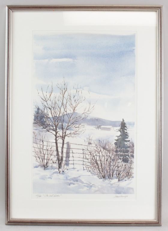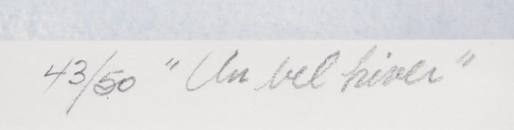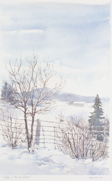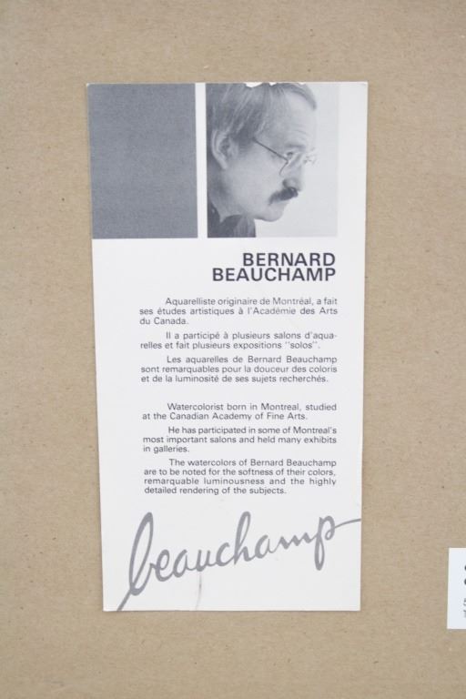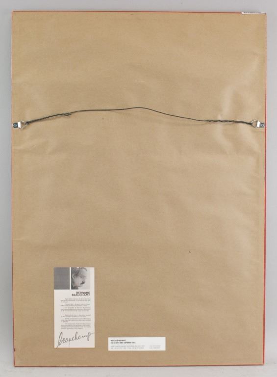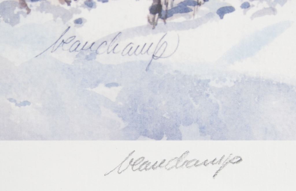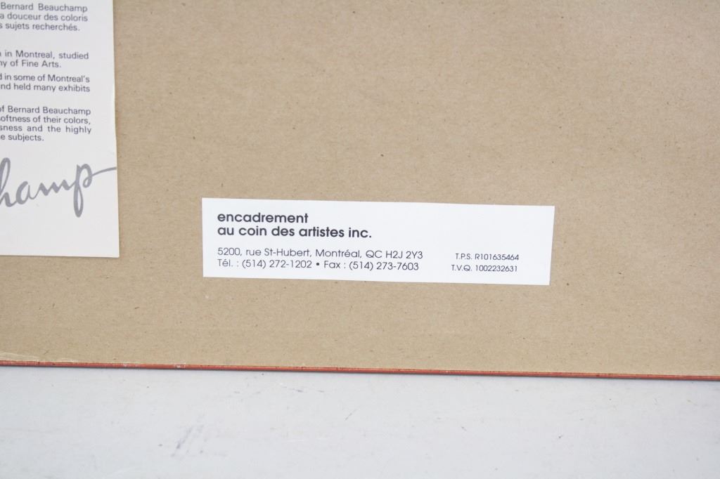 Lithograph print on paper, framed. Featuring wintery landscape scene. Numbered: 43/50. "Un bel bisou" inscribed beside the number. Signed "beauchamp" to the bottom right. Artist biography in French on verso. Attributed to Benard Beauchamp (Canadian). Paper size: 51 x 32 cm (20 x 12.5 inches). Frame size: 67 x 48 cm (26.5 x 19 inches).