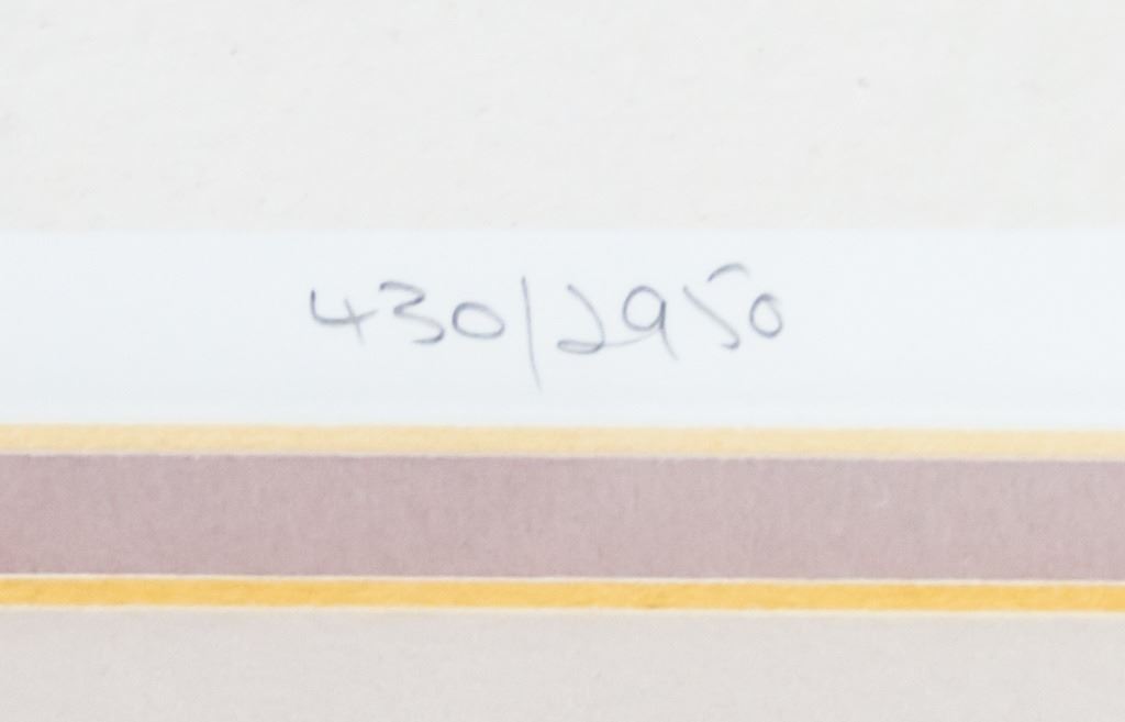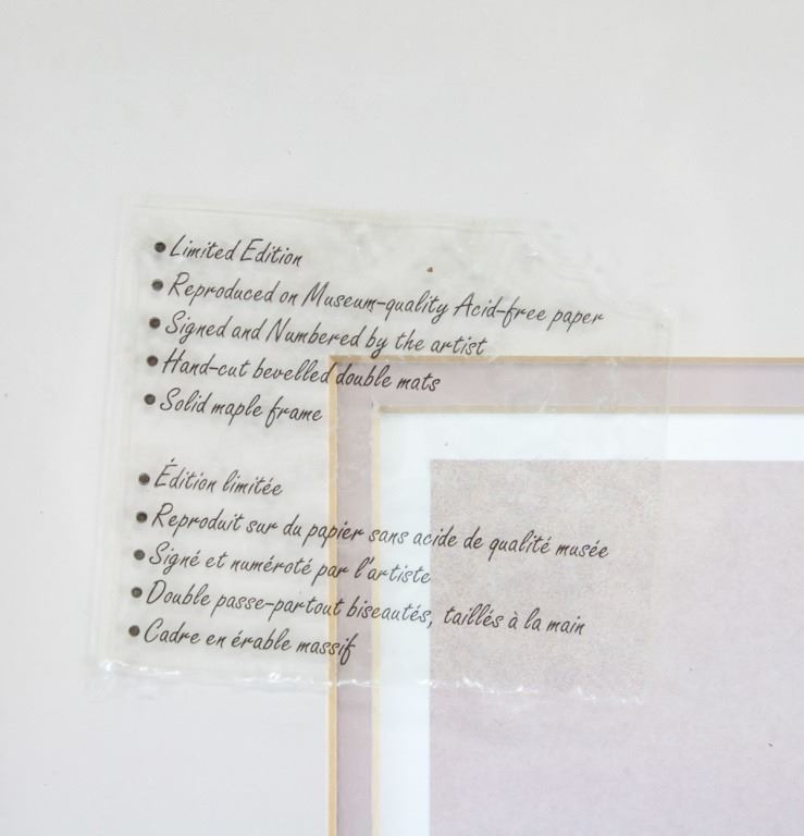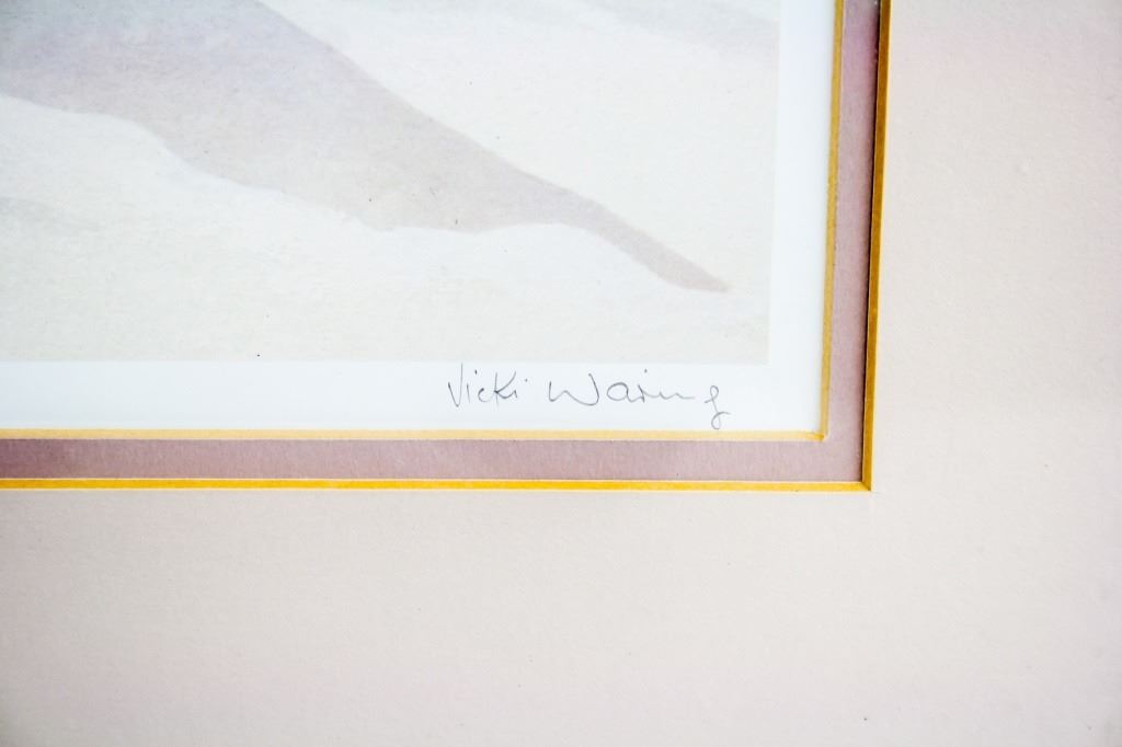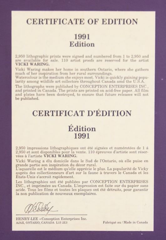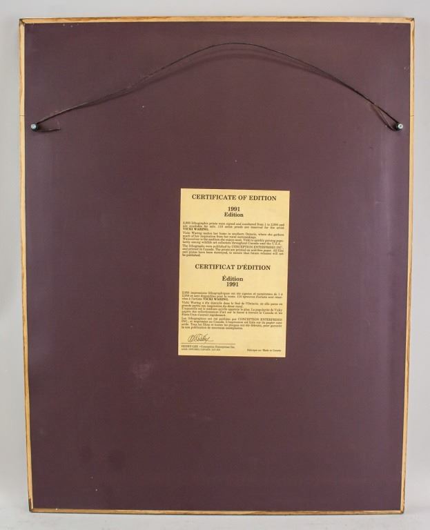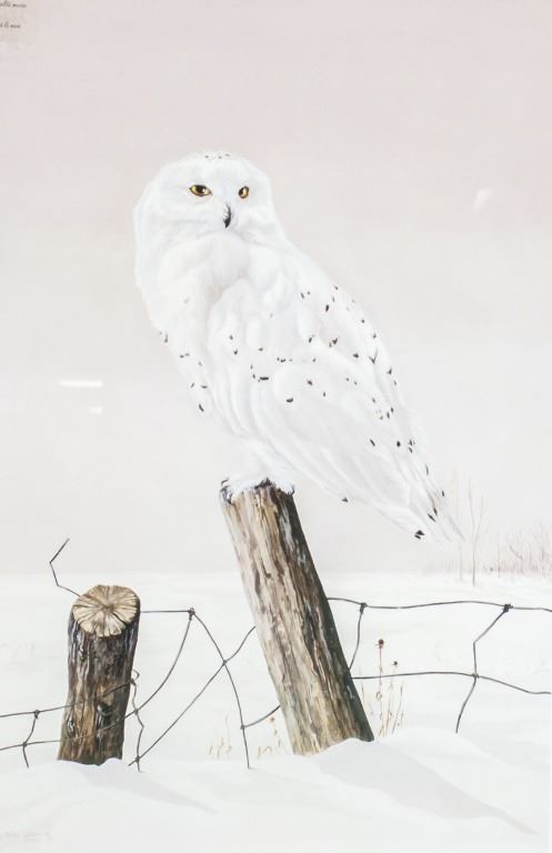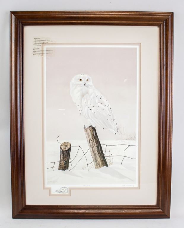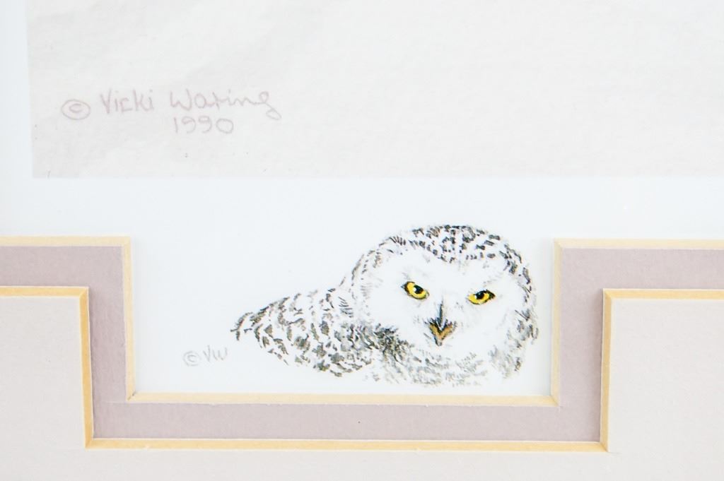 Lithograph print on paper, framed. Featuring large snowy owl perched on a fence post. Signed "Vicki Waring" to the bottom right corner. Numbered 430/2950. Certificate of Edition attached to verso. Vicki Waring (Canadian). Paper size: 47 x 29.5 cm (66 x 51.5 inches). Frame size: 66 x 51.5 cm (26 x 20.25 inches).