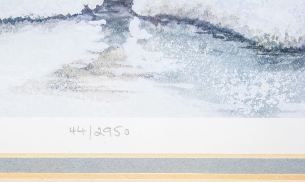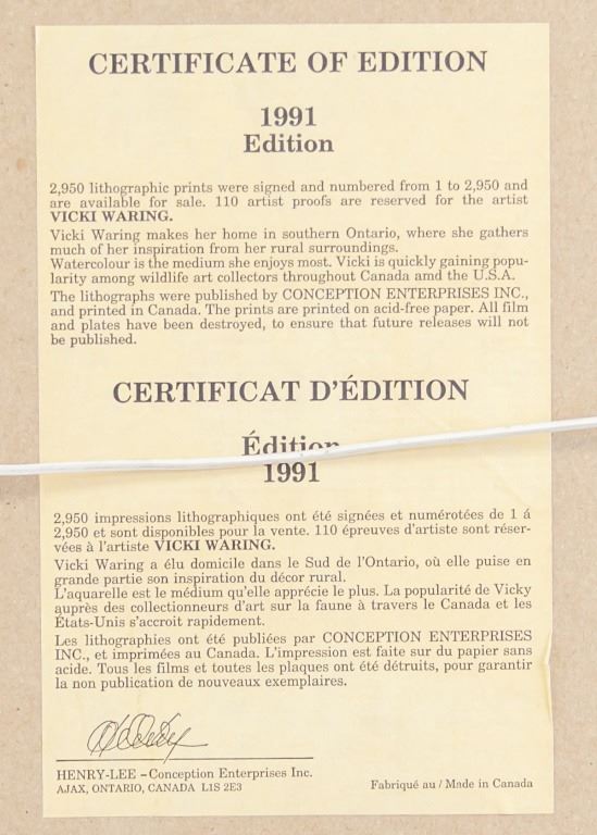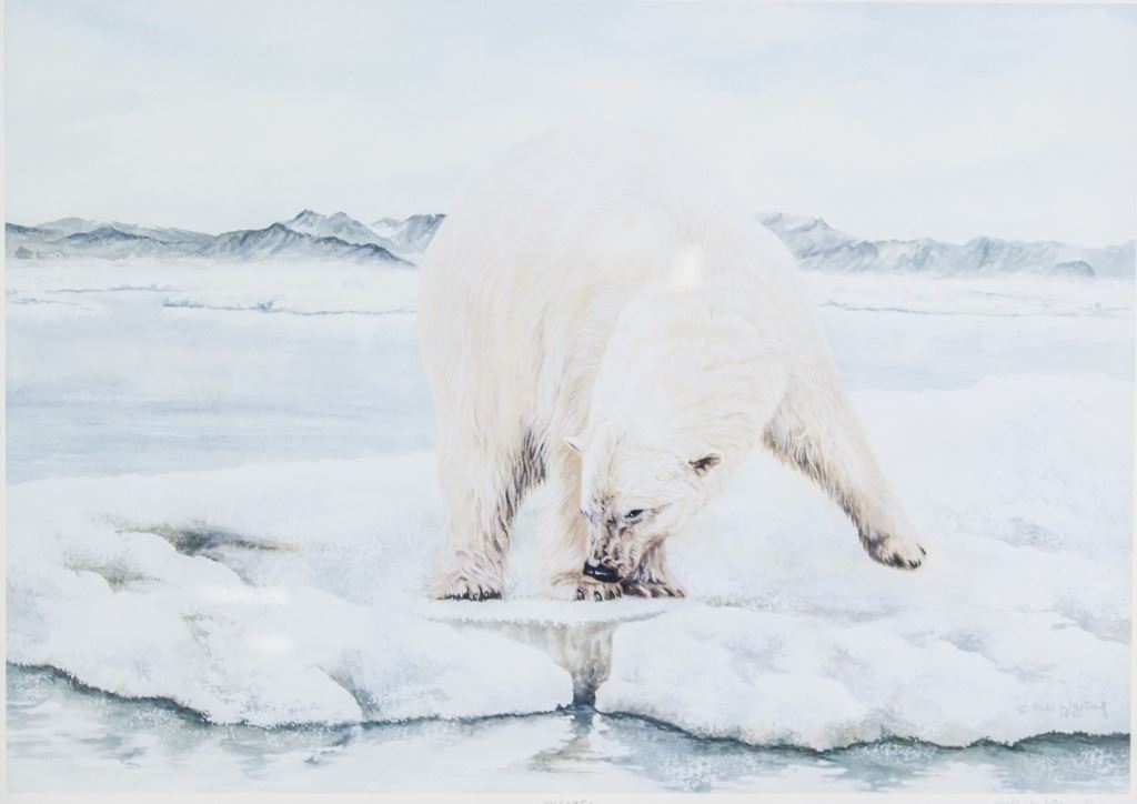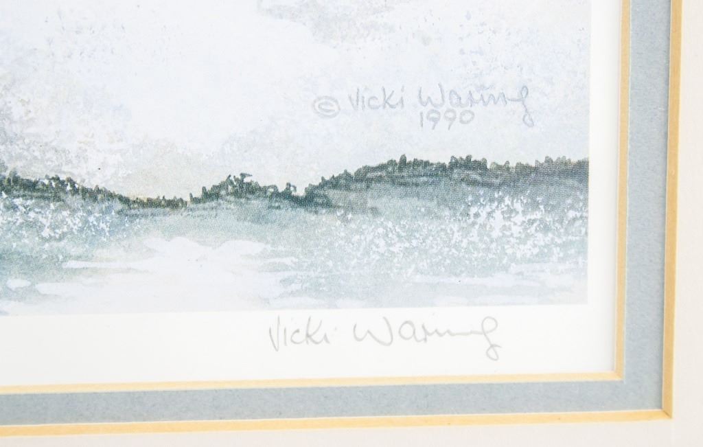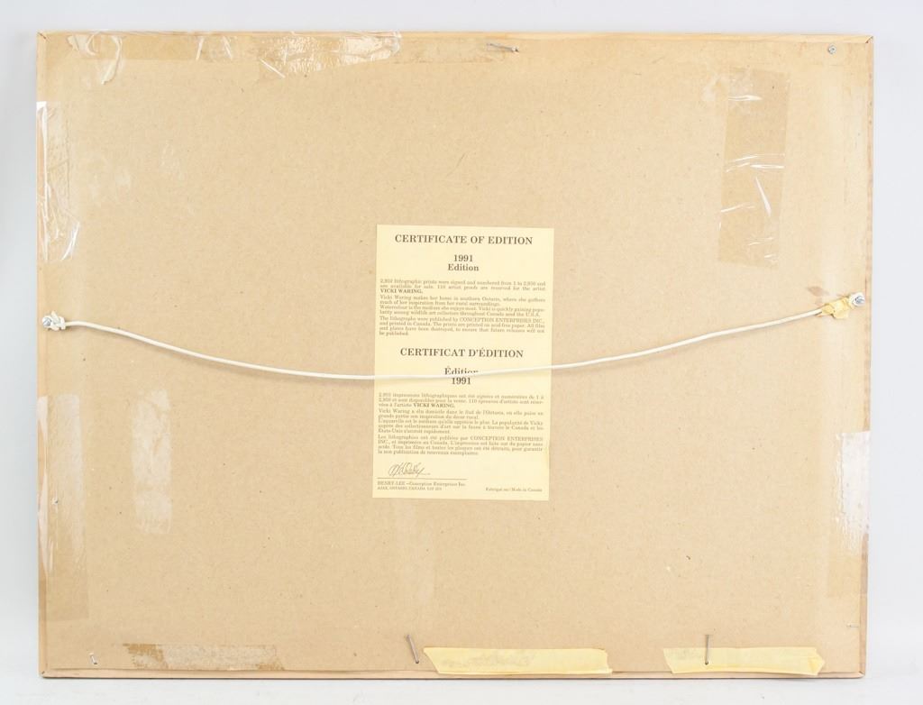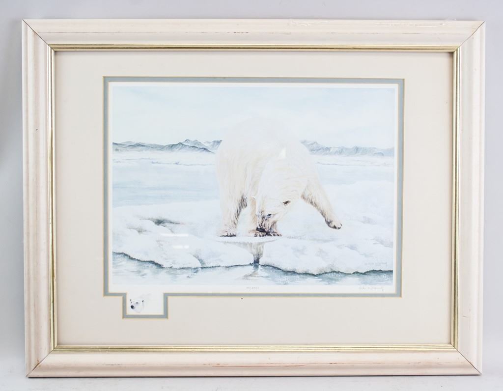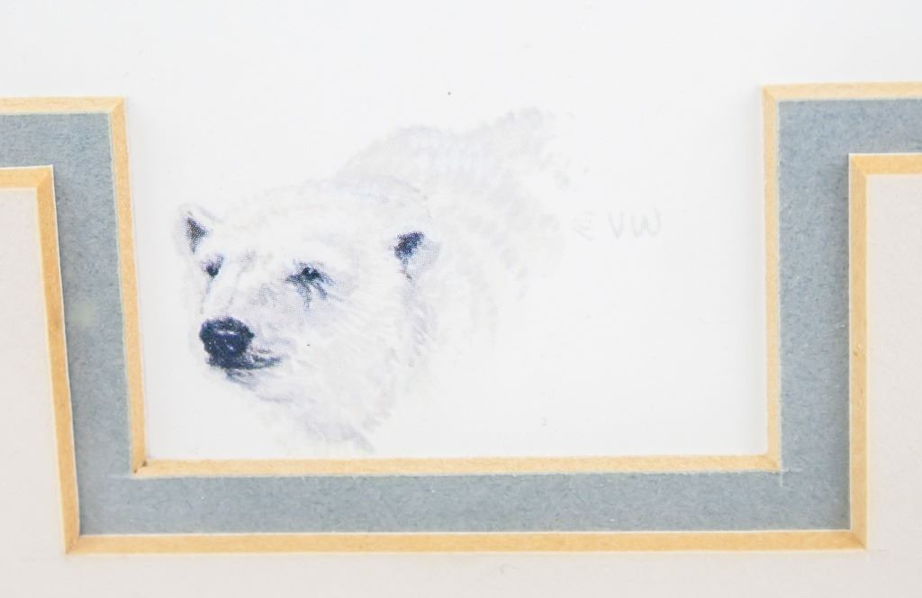 Lithograph print on paper, framed. Featuring polar bear on ice. Signed "Vicki Waring" to the bottom right corner. Numbered: 44/2950. Certificate of Edition attached to verso. Attributed to Vicki Waring (Canadian). Paper size: 33 x 41 cm 913 x 16.25 inches). Frame size: 51 x 66 cm (20 x 26 inches).