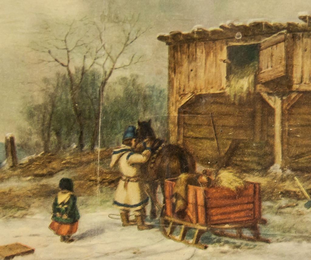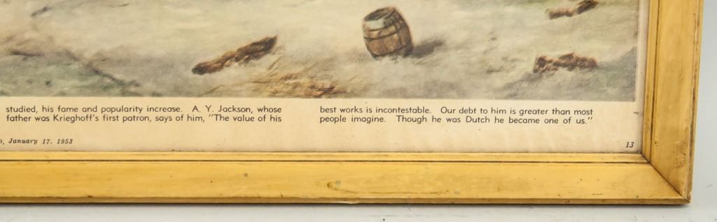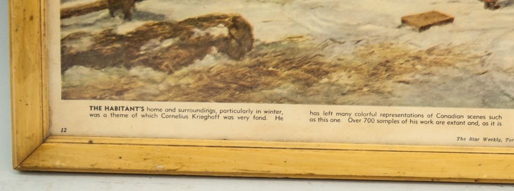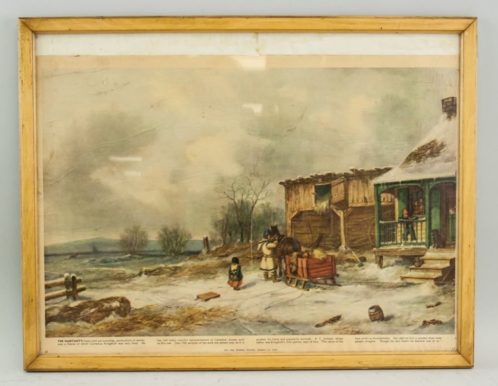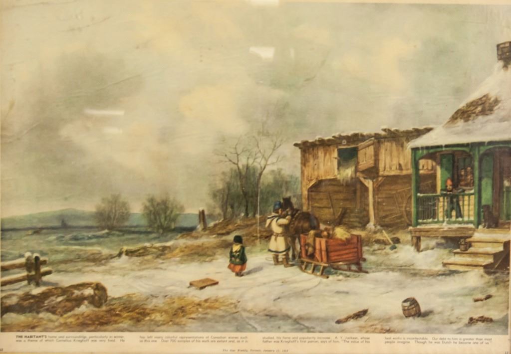 Lithograph on paper, framed. Featuring winter landscape with a figure hitching a horse while a child looks on. Text beneath the image reads "THE HABITANT'S home and surroundings, particularly in winter, was a theme of which Cornelius Krieghoff was very fond. He has left many colorful represnetations of Canadian scenes such as this one. Over 700 samples of his work are extant and, as it is studied, his fame and popularity increase. A. Y. Jackson, whose father was Krieghoff's first patron, says of him, "The value of his best works is contestable. OUr debt to him is greater than most people imagine. Though he was Dutch he ebcame one of us". Plate size: 40 x 52 cm (15.5 x 30.25 inches). Paper size: 44 x 56 cm (17 x 22 inches).