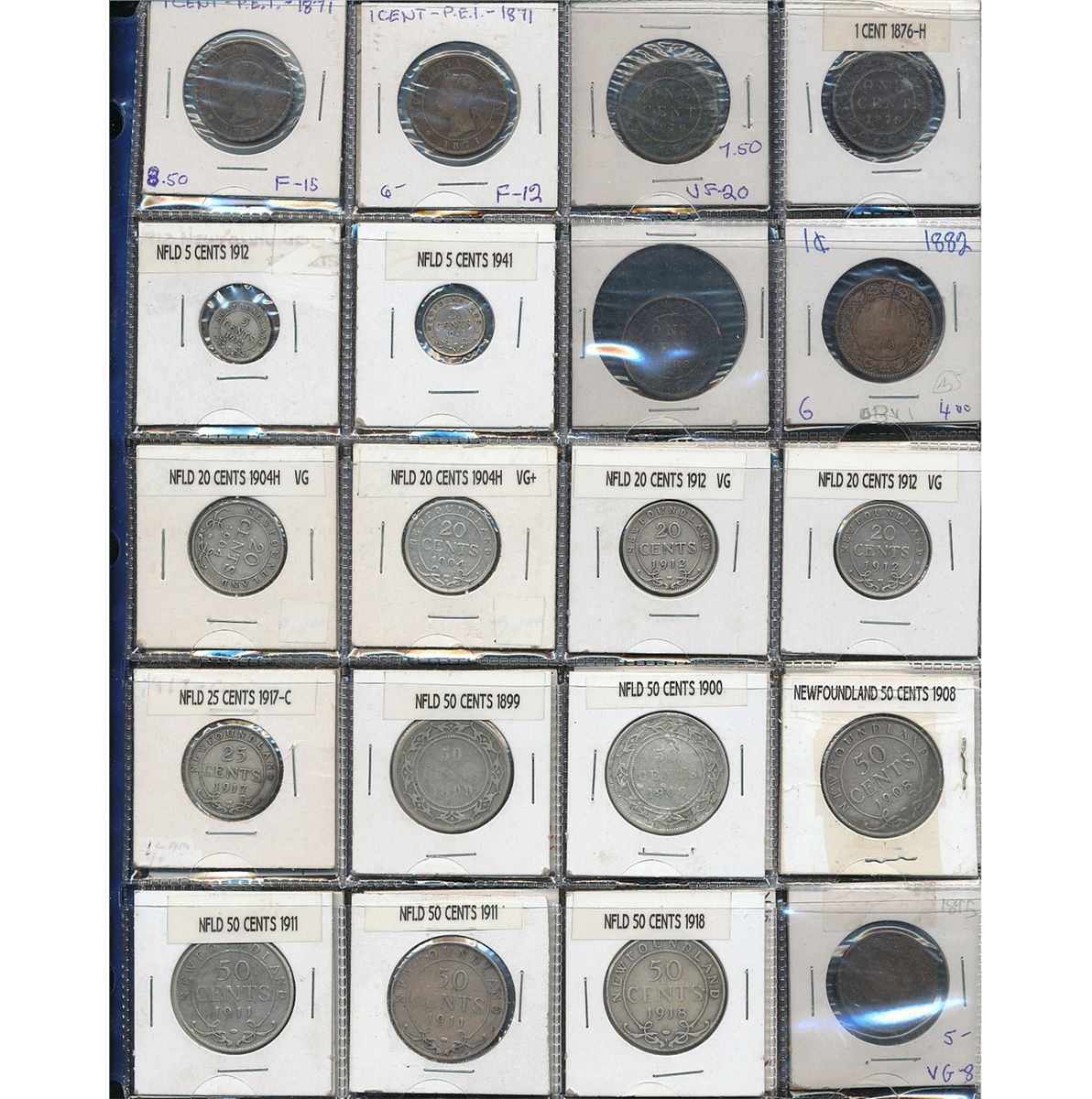 Canadian & Maritimes Coinage Lot; includes Maritimes issues 1871 1¢(2), Nfld 1912 1941c 5¢, 194-04H(2), 1912(2) 20¢, 1917c 25¢, 1899, 1900, 1908, 1911(2) & 1918c 50¢, Canada 1859-2010 1¢, 1870-2009 5¢ & 1900-2005 10¢. All incomplete date sets. Includ