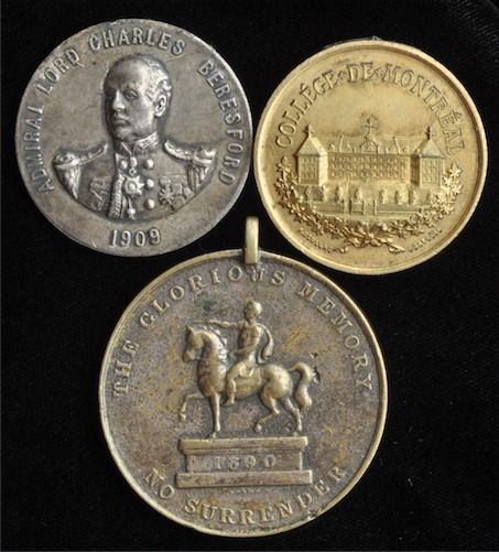 College de Montreal - 1767-1885. AE gilt 37mm, Ler 1220. Suspender removed, otherwise EF. The Glorious Memory/1690/No Surrender. AE 46mm with suspender loop. Aftercast of Ler 732 VF. Toronto Industrial Exhibition Association 1909. AR 38mm. VF. 3 Pcs