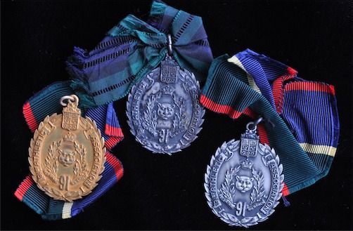 91st Athletic Association - (Argyle & Sutherland Highlands of Canada, Hamilton). 3 Oval medals with ribbons. First place Inter City Girls Relay, Gold Filled and two third place in Sterling. 31x40mm by T.Lees, circa 1920s. EF. 3 Pcs.