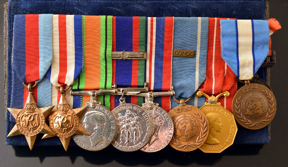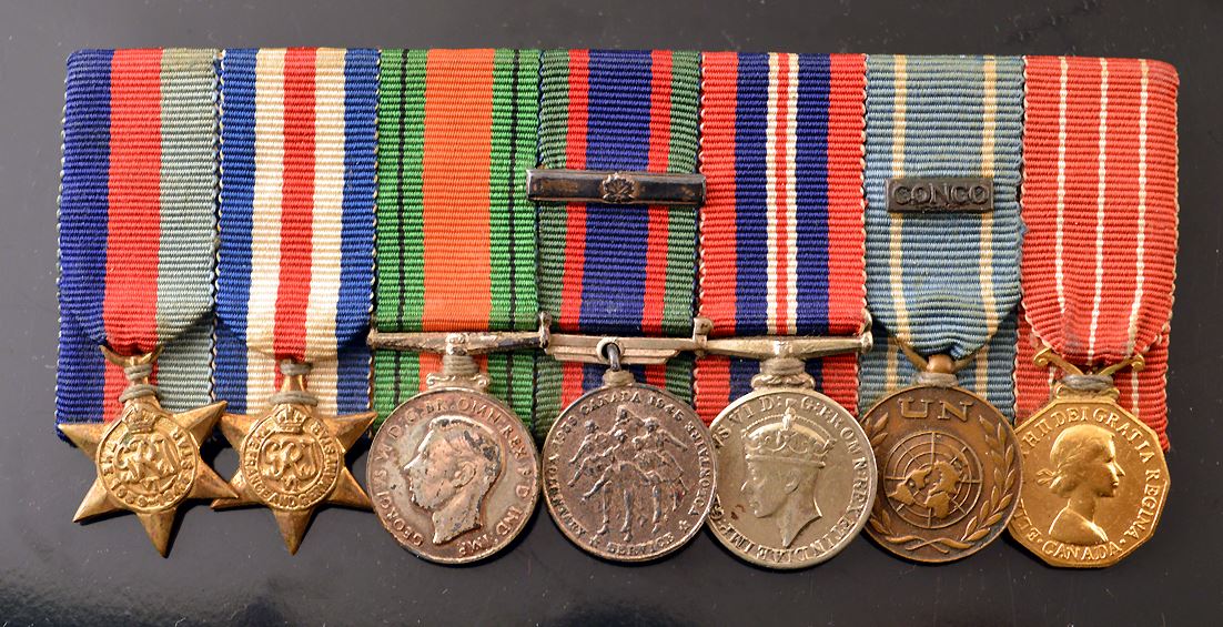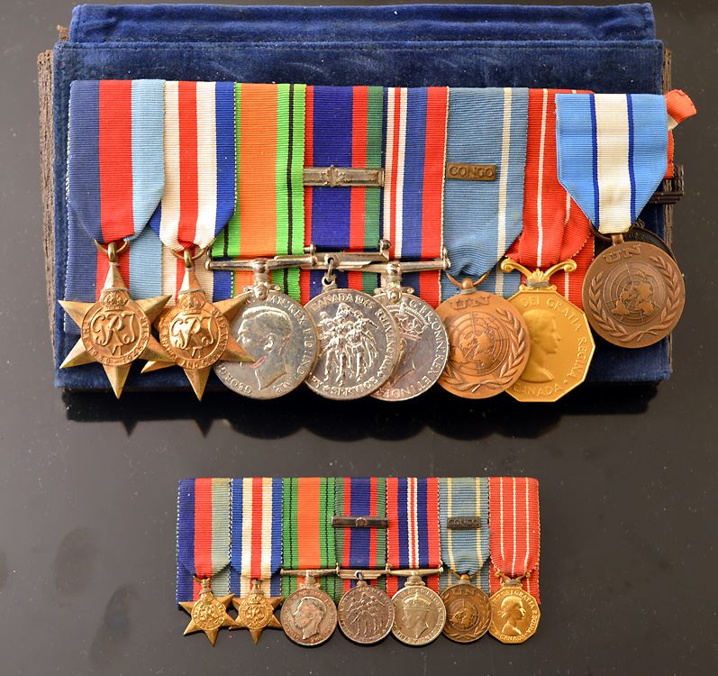 Canadian Military medal group of 8, consisting of: 1939-1945 Star; France and Germany Star; Canadian Defense Medal; CVSM; 1939-1945 War Medal; United Ntions medal, "CONGO" bar; QEII CD Award, impressed "CAPT. J.M. BERTHIAUME"; International Commission fdor Supervision and Control, Peace, Myanmar on back, Ae, impressed "A/MAJ J.E.J. BERTHIAUME"; UN Medal; included are the Miniatures of the first seven; All court mounted, with pin back, except last UN medal, which is separately hung; Silver medals are cleaned, rest essentially as issued; Unsure of the reason for two different initials, other than a family group. Curiously, a (Joseph Horace André) Jean Berthiaume started the UN mission in Congo, after 1960, and was a Lieutenant Colonel there. An interesting lot.