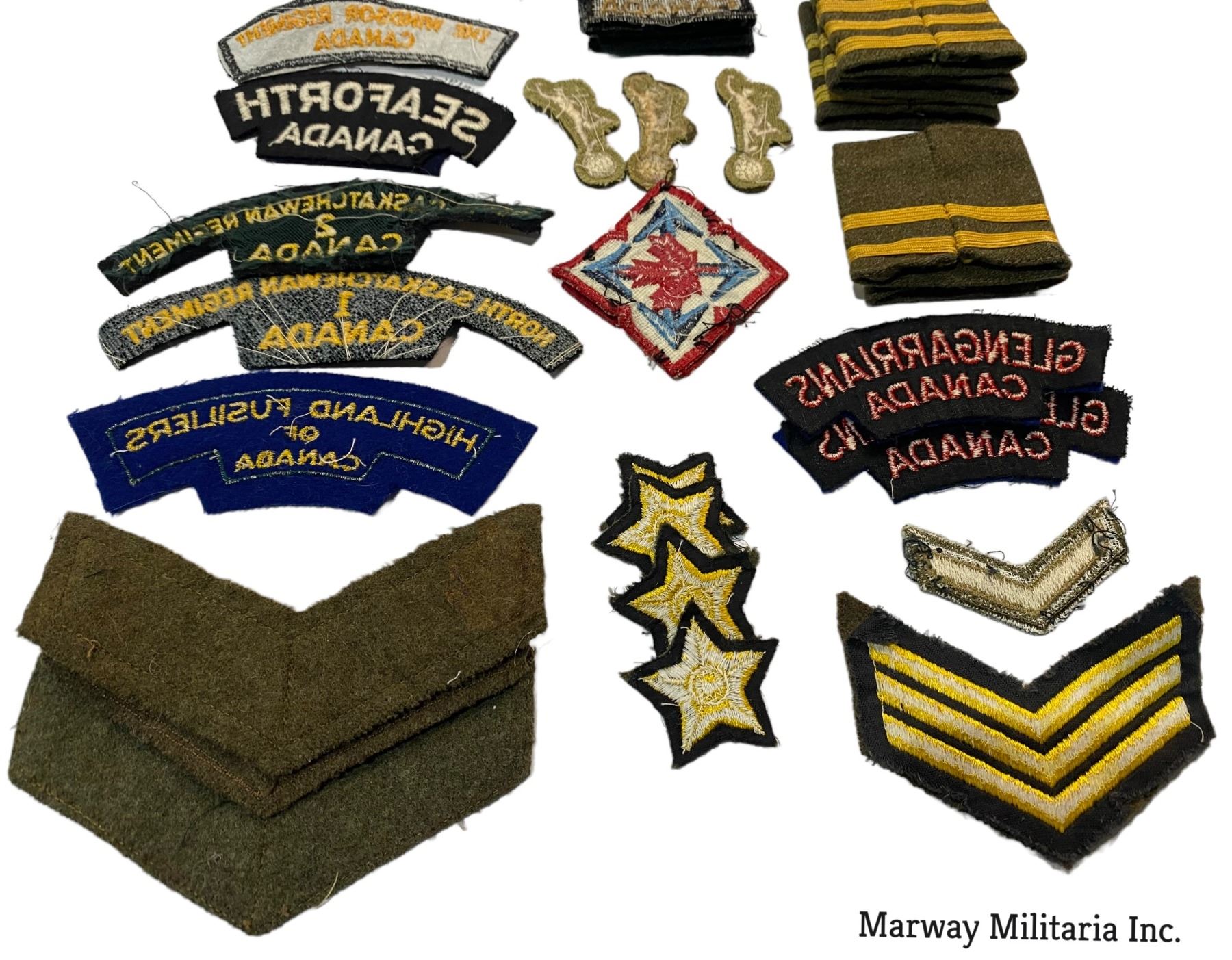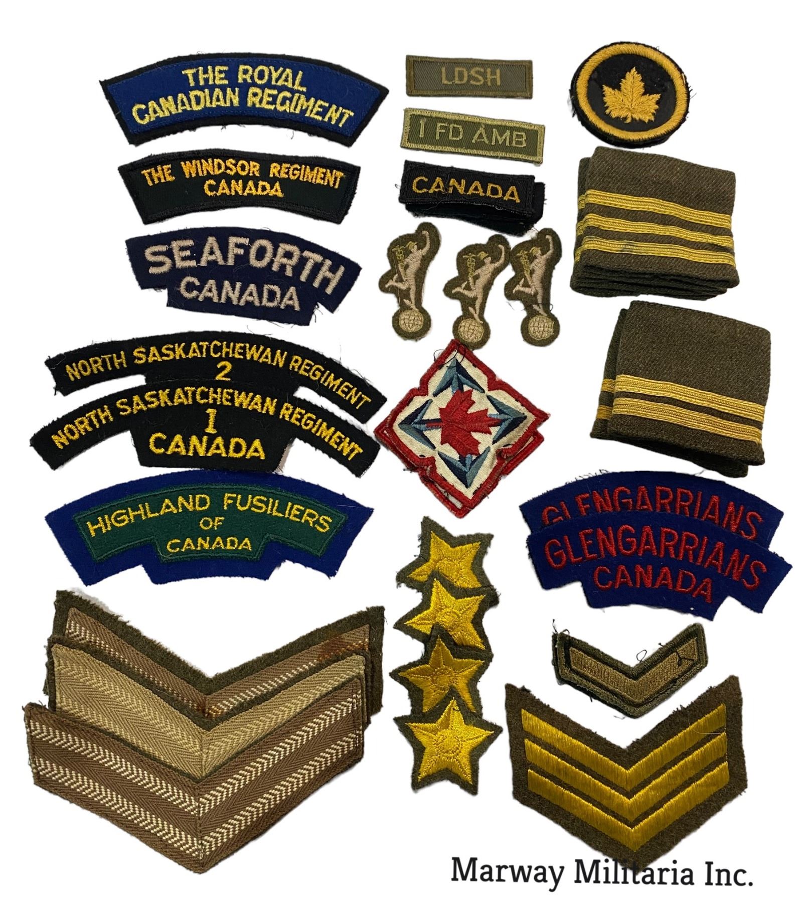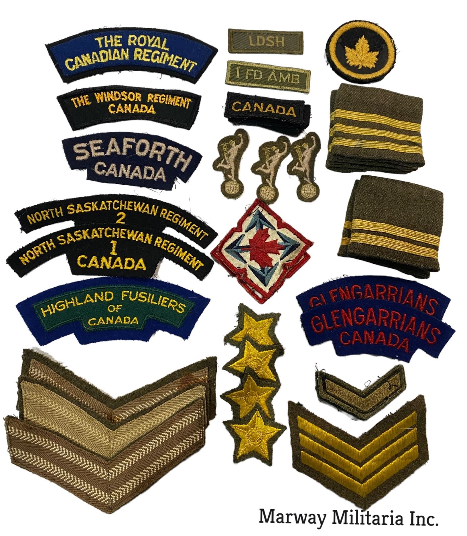 Lot Includes, 38 Various Patches & More. Highland |Light Infantry, Seaforth Highlanders, Numerous Combat tabs, rank insignia and more