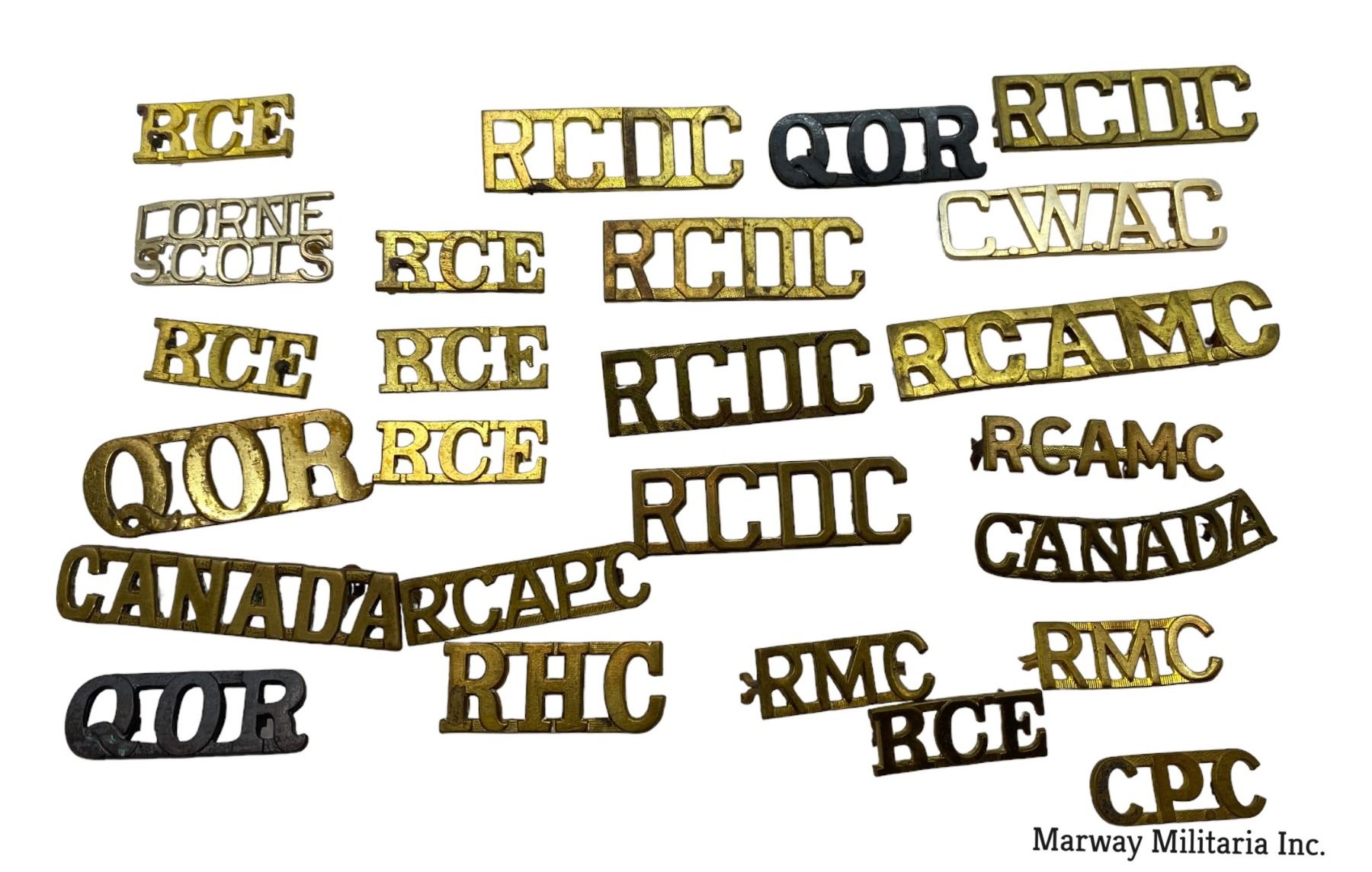 Lot of 25 Metal Titles. Includes Canada Nationality Titles, Queens Own Rifles, Dental Corps, Engineers and more