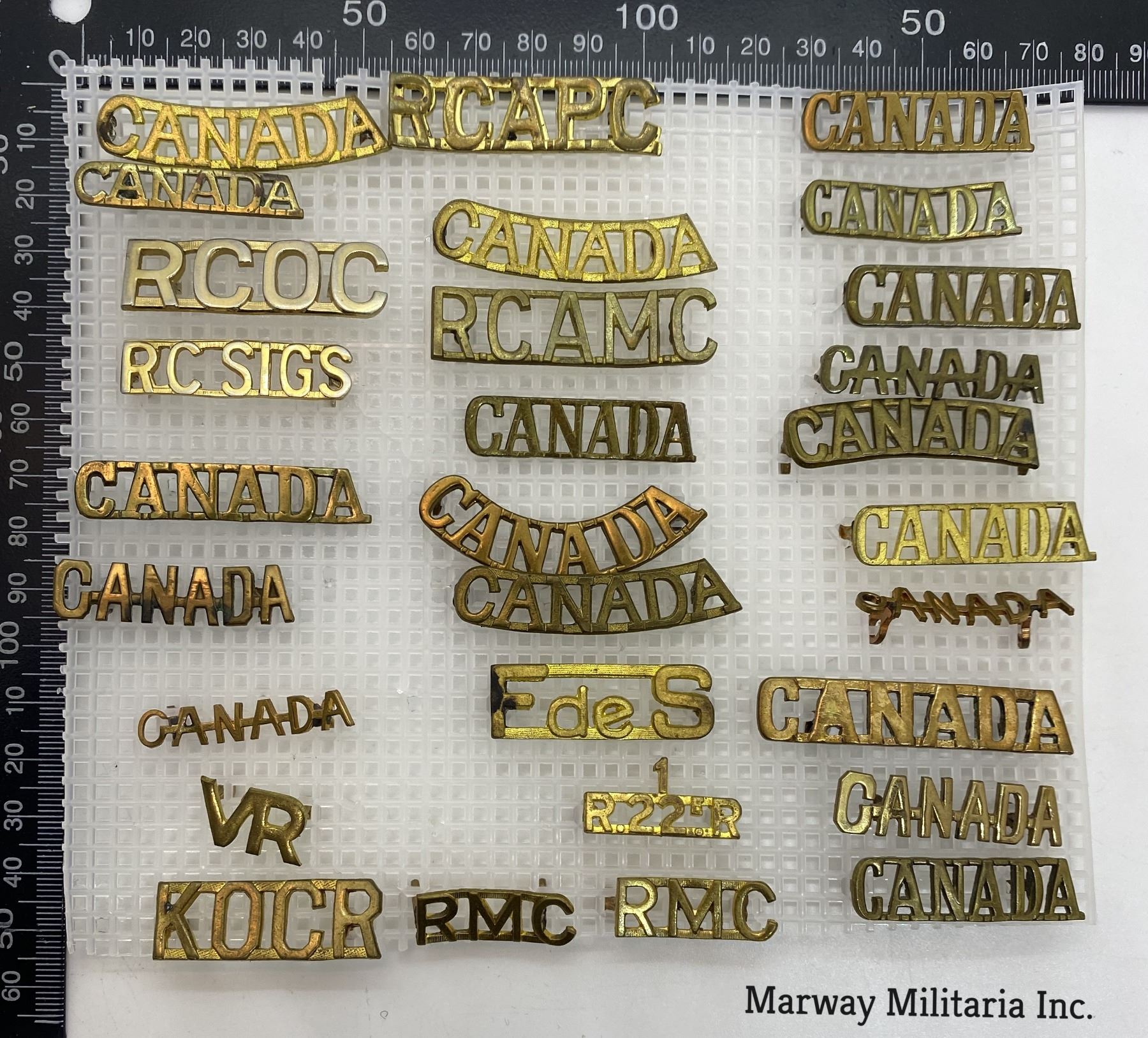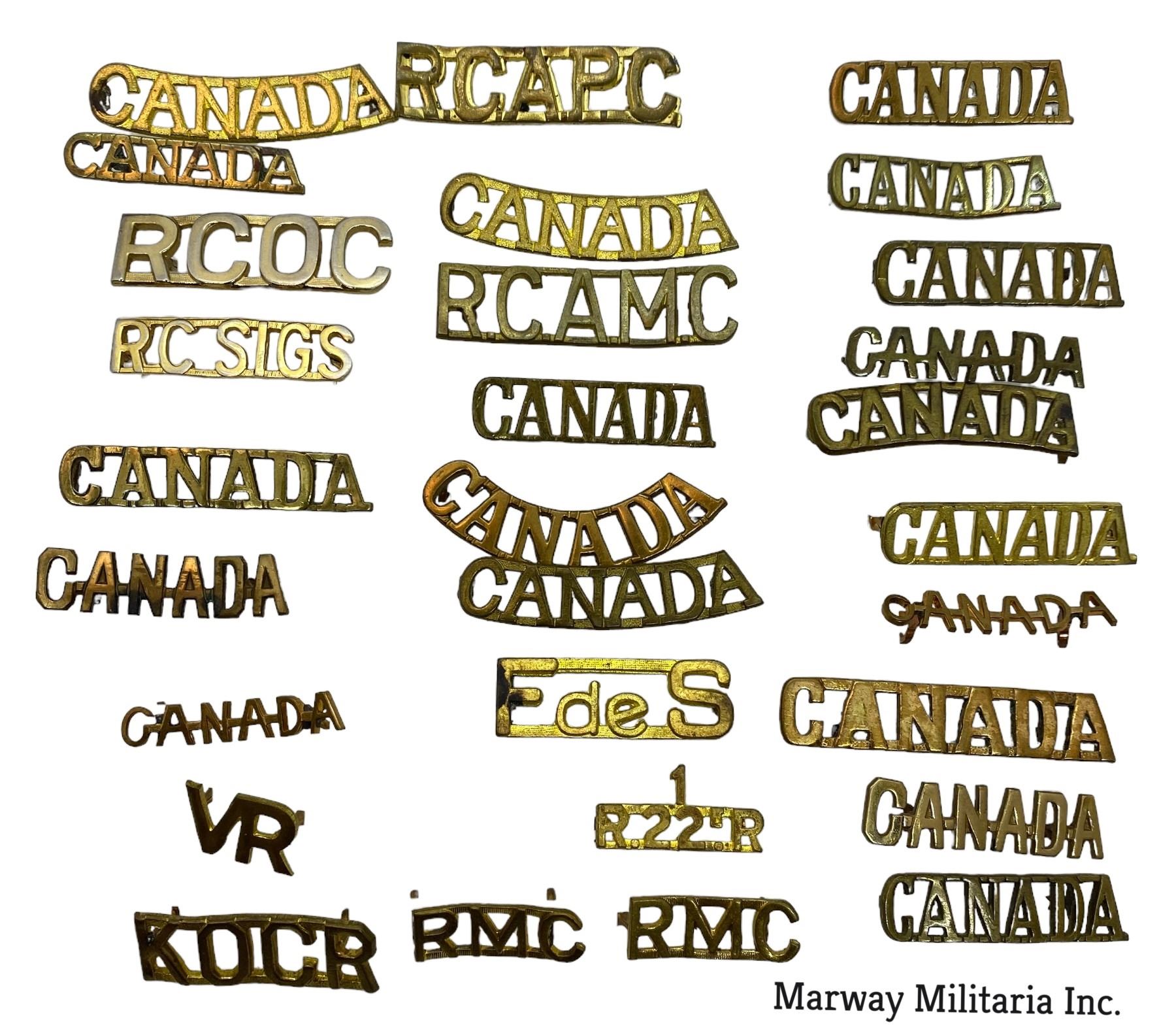 Lot of 29 Metal Titles. Includes Canada Nationality Titles, Kings Own Calgary Regiment, Royal Cdn Army Medical Corps, RMC etc.