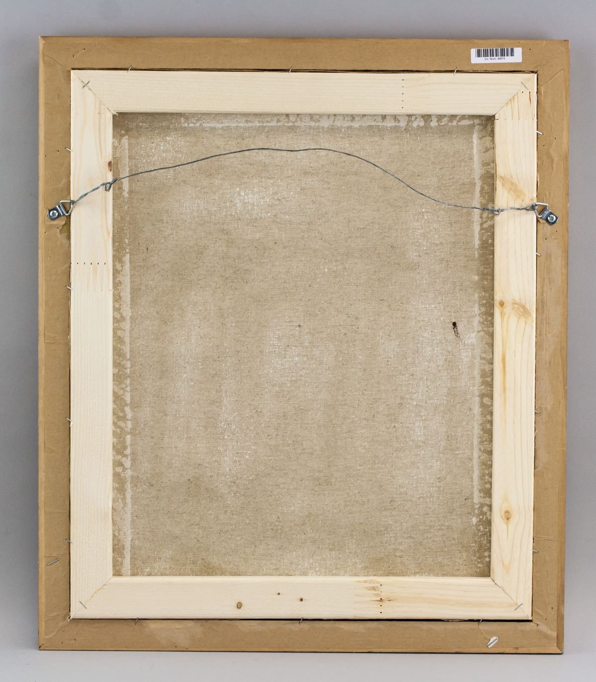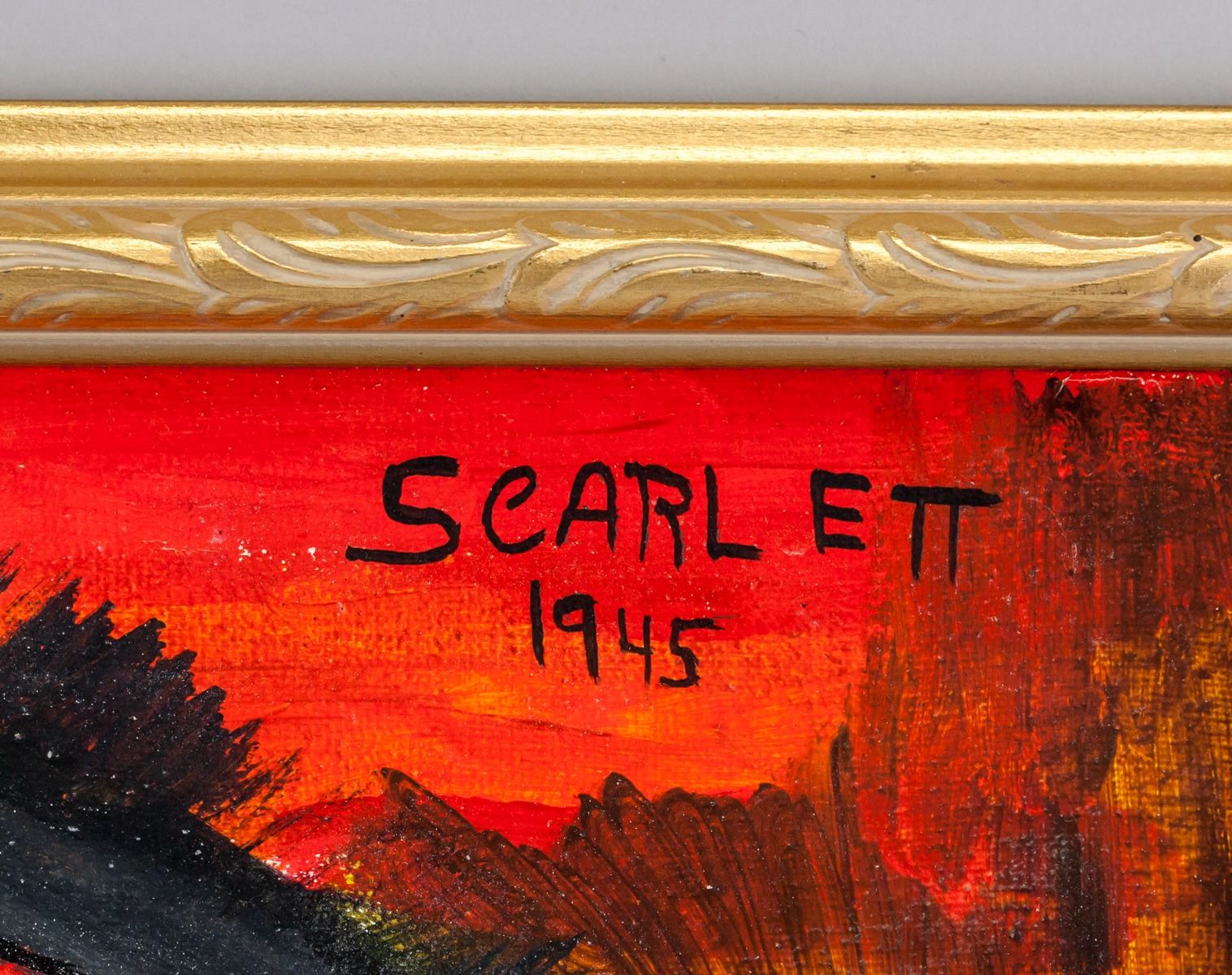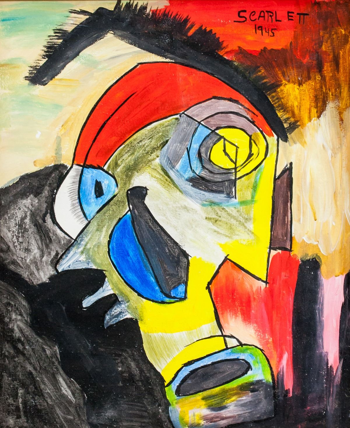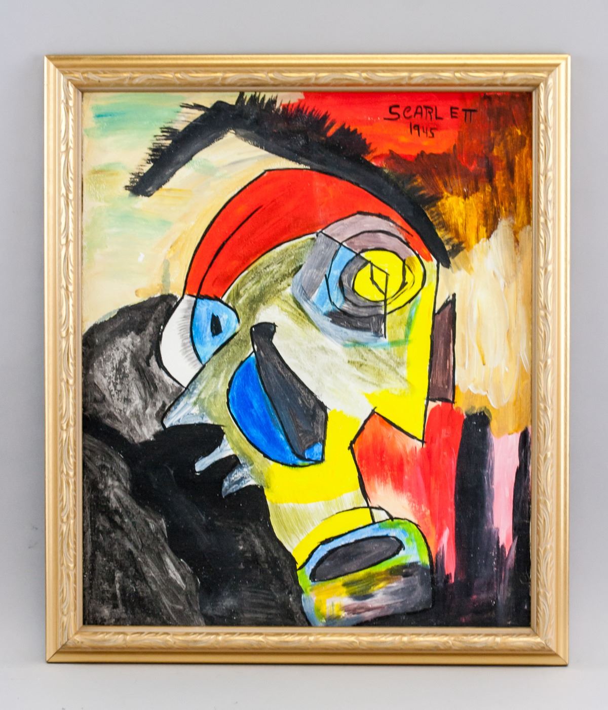 Oil on canvas, framed. Featuring abstract composition. Signed "SCARLETT" in the upper right corner with