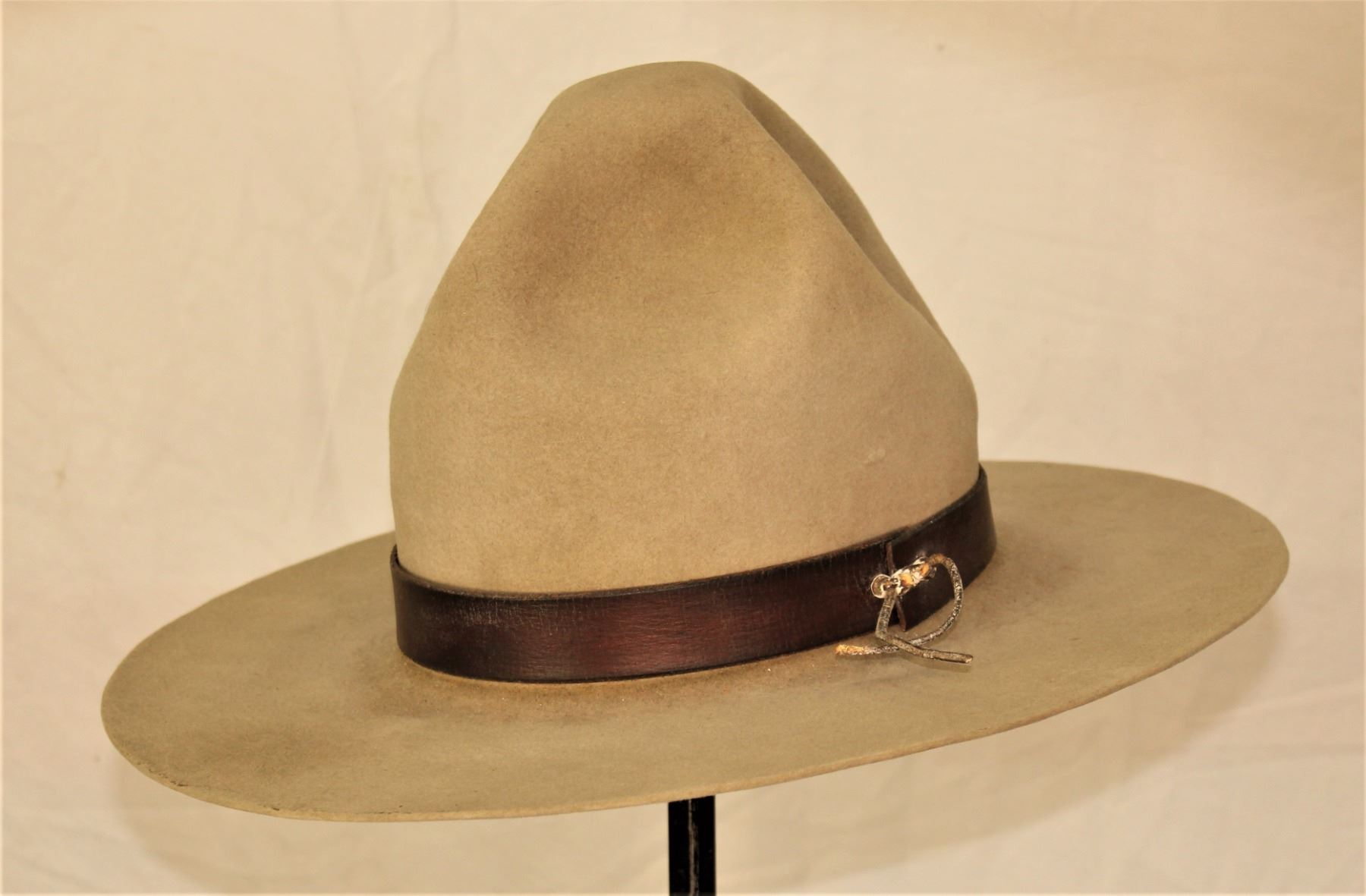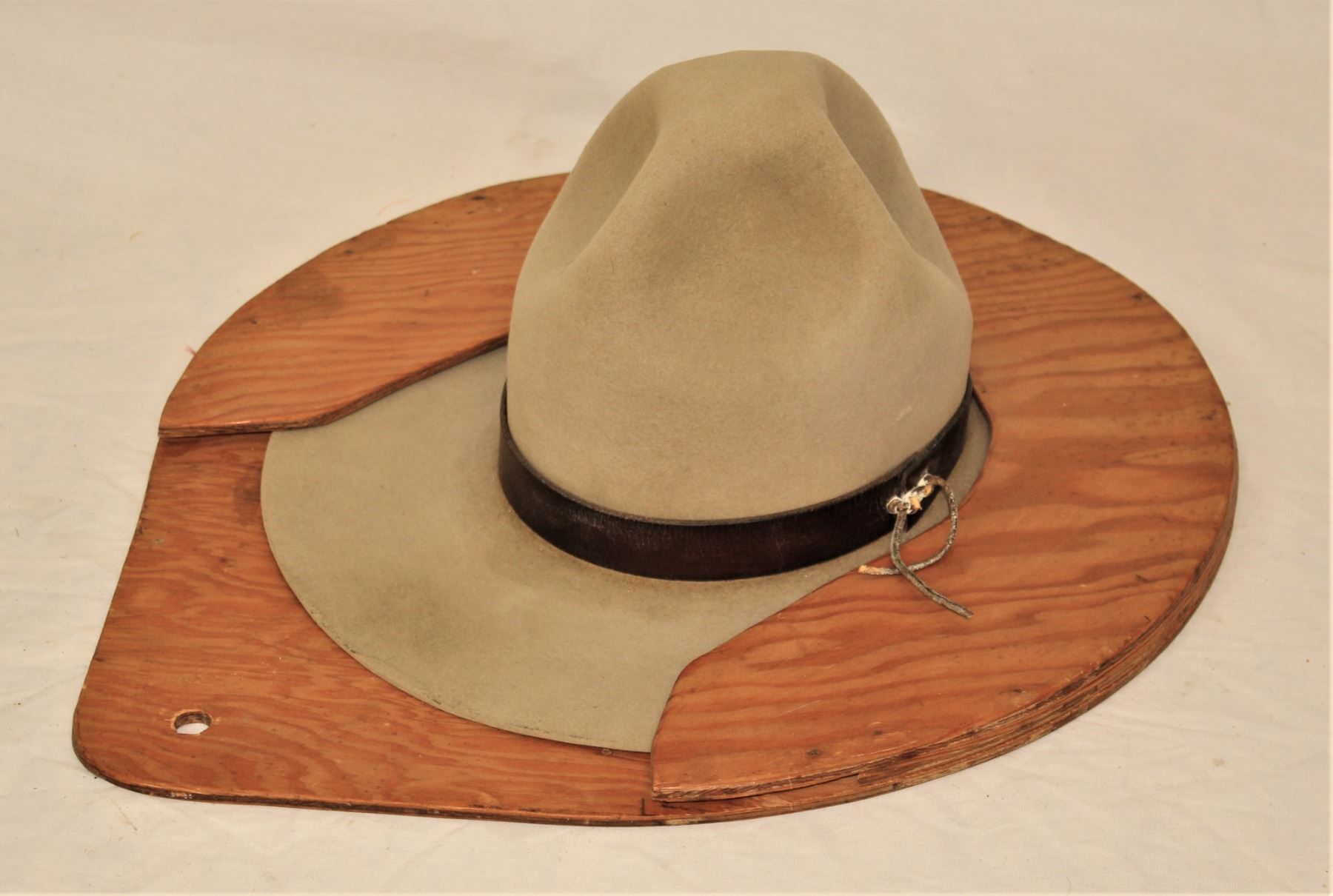 Interesting hat sold by Cliff Saddlery of Calgary, that is accompanied by a homemade wooden hat holder that preserves its shape.