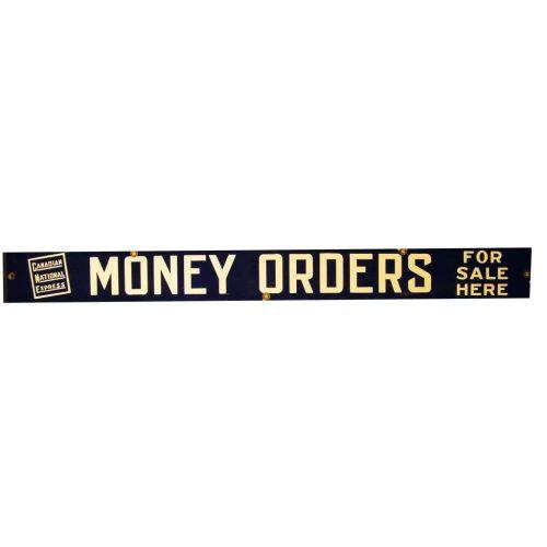 Canadian National Express Money Orders Porcelain Sign. Couple of tiny chips on edges otherwise excellent condition. 30 X 3 inches.
