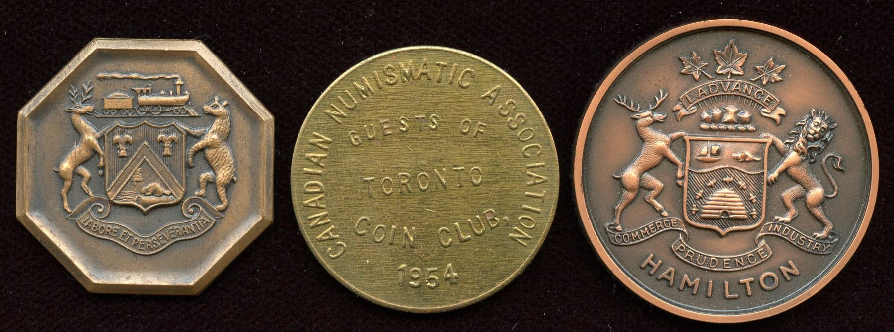 Toronto, 1954, brass restrike, 300 issued; London, 1956, bronze, 125 issued; Hamilton, bronze, 200 issued. 3 Pcs.