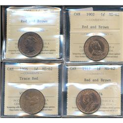 1901 1¢, 1902, 1906 & 1917 all ICCS MS62 Trace Red to RB. Lot of 4 coins.