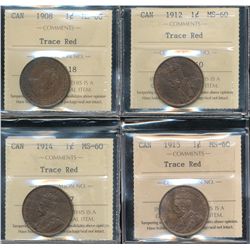 1908 1¢, 1912, 1914 & 1915 ICCS MS60 Trace Red. Lot of 4 coins.