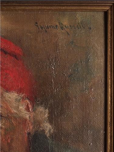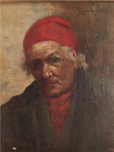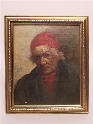 Description: Signed G(eorge) Horne Russel Portrait of a Man with Red Cap Tiny Paint Fleck Bottom Left