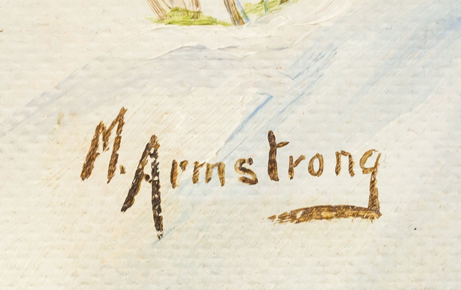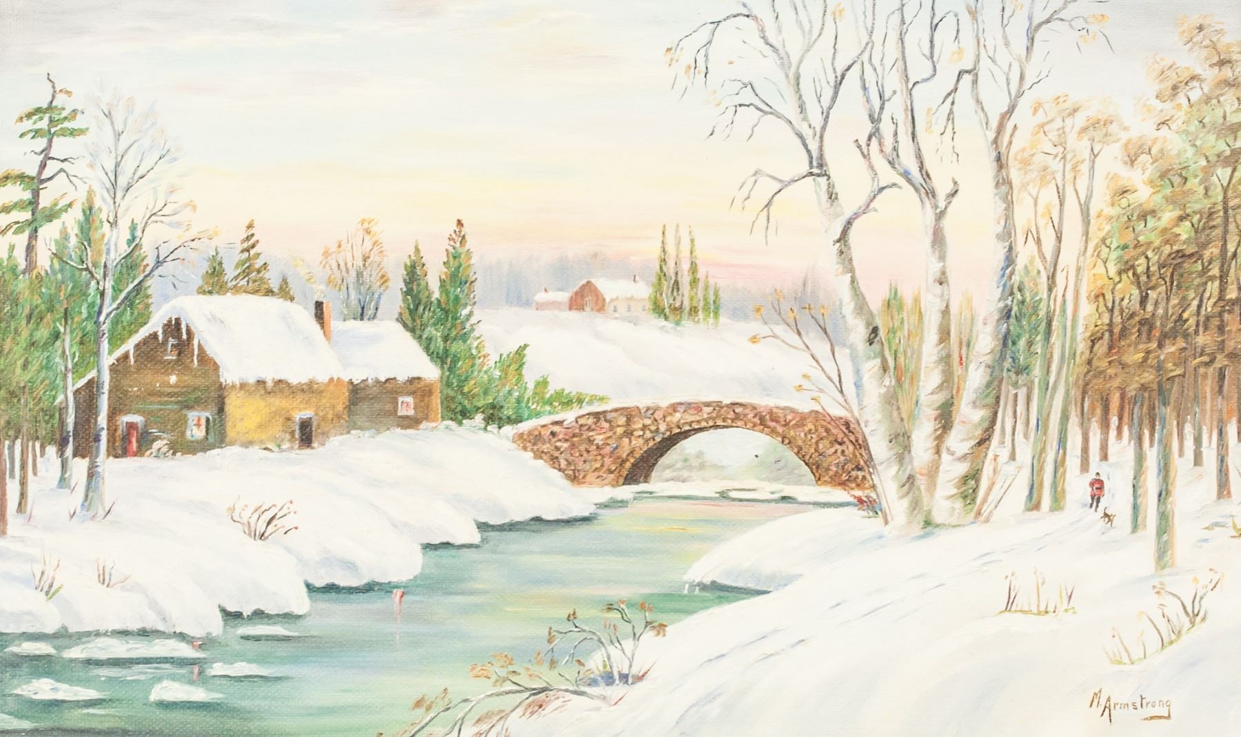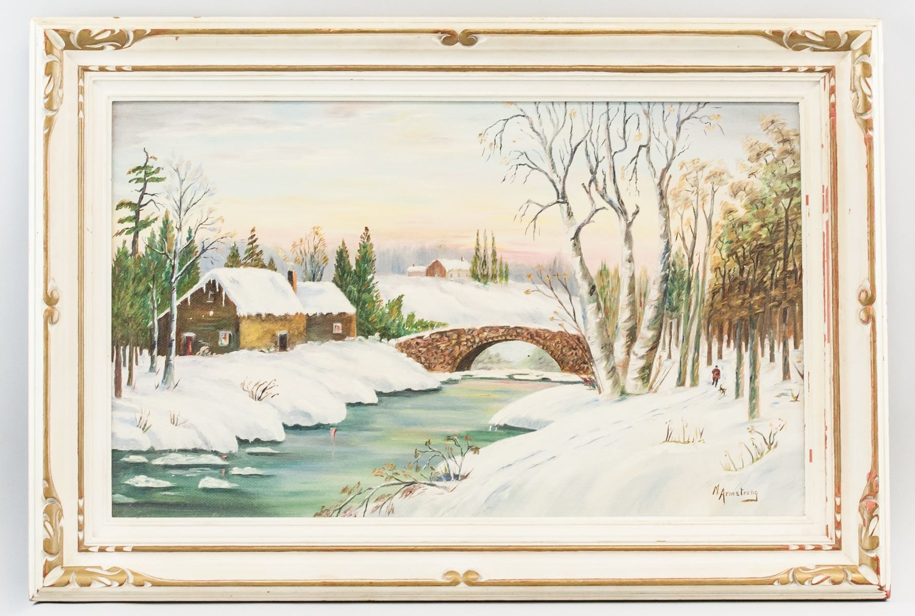 Oil on board, framed. Featuring snowy landscape with a small house by a river with a stone bridge crossing over the river. A figure with a dog walks toward the bridge on the right side. Signed "M Armstrong" to the bottom right. 43 x 69 cm (17 x 27 in), Frame: 61 x 86 cm (24 x 34 in).