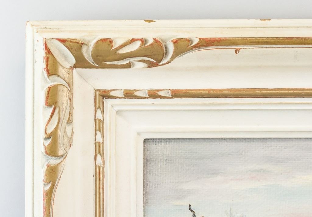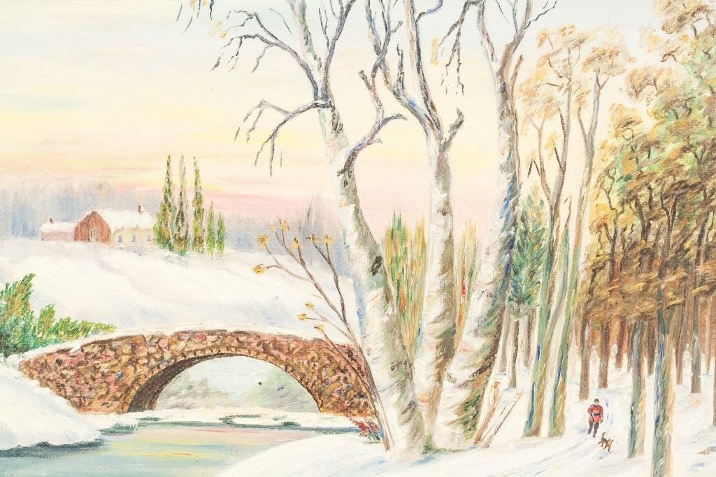 Oil on board, framed. Featuring snowy landscape with a small house by a river with a stone bridge crossing over the river. A figure with a dog walks toward the bridge on the right side. Signed "M Armstrong" to the bottom right. 43 x 69 cm (17 x 27 in), Frame: 61 x 86 cm (24 x 34 in).