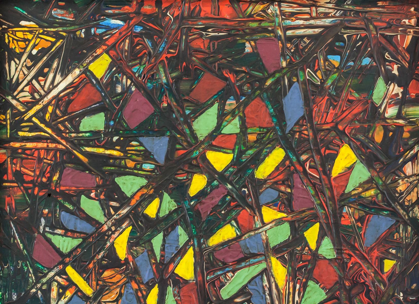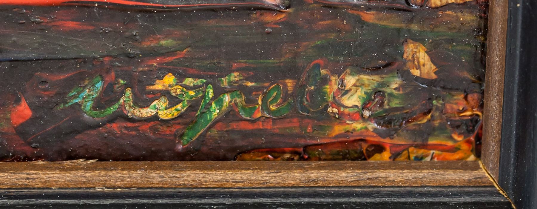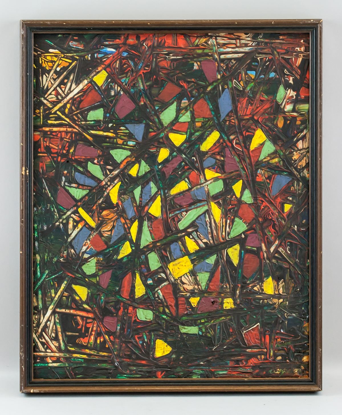 Oil on canvas, framed. Featuring an abstract expressionist composition. Signed illegibly on the lower right corner. 50.5 x 40.5 cm (20 x 16 inches). Framed size: 54.5 x 44 cm (21.5 x 17.3 inches). PROVENANCE: Southern Ontario estate