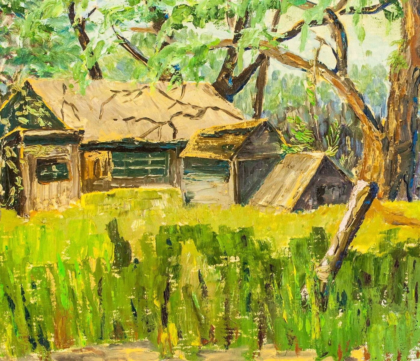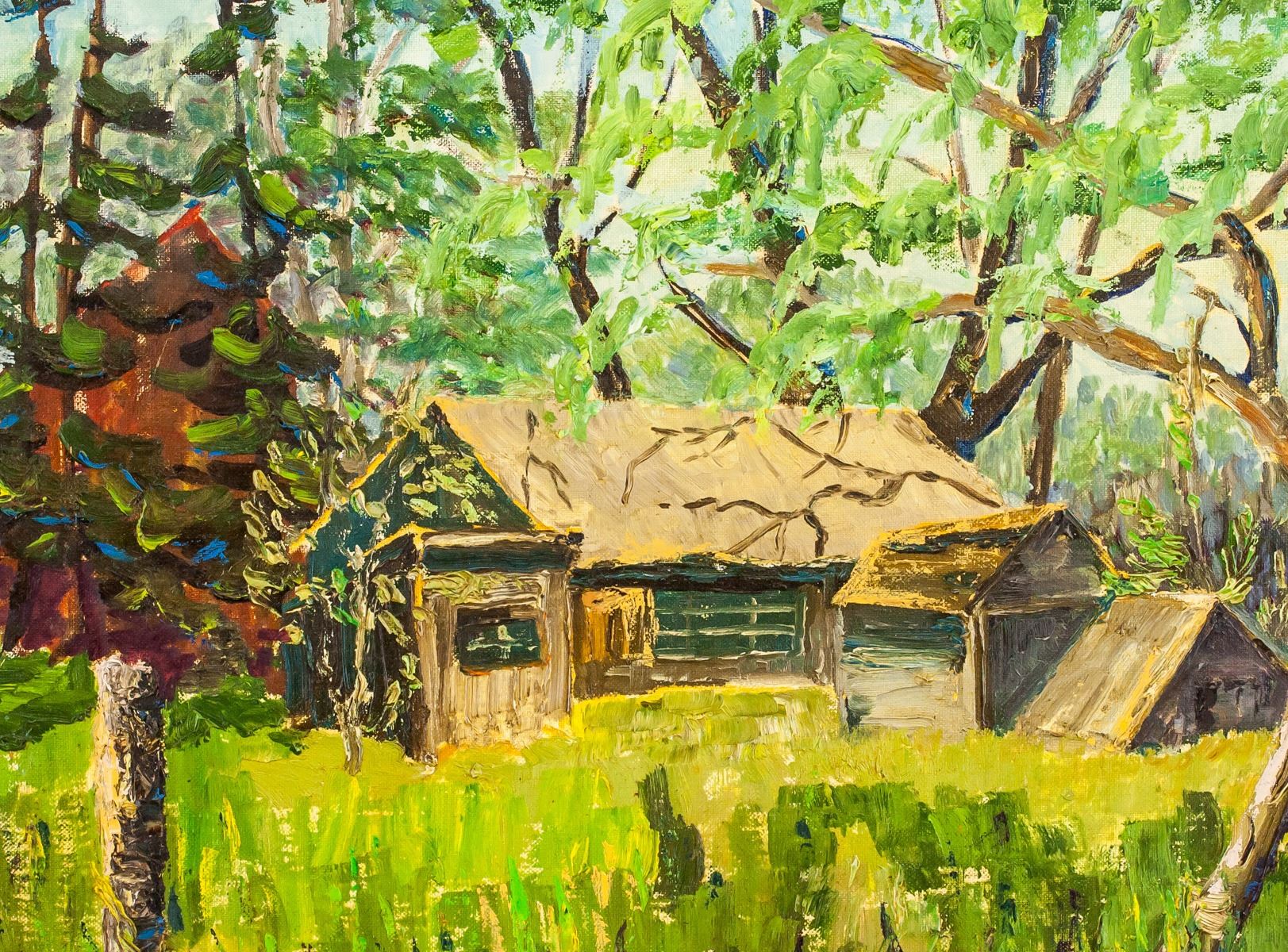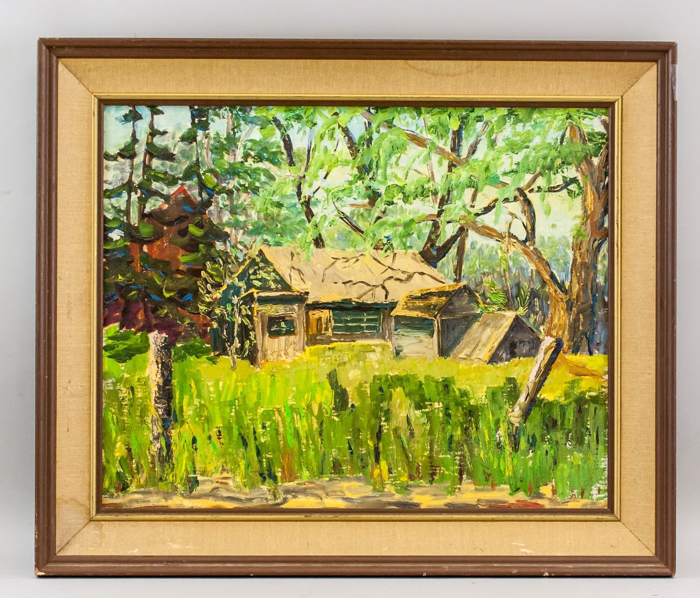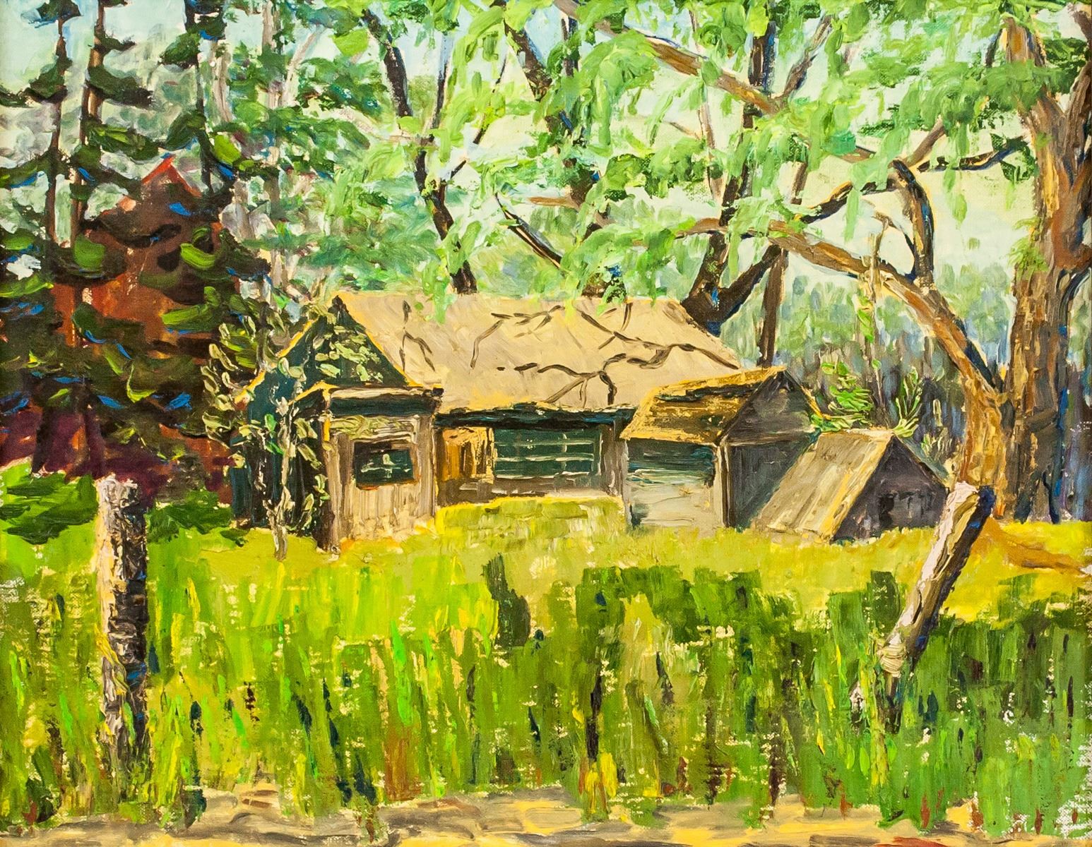 Oil on board, framed. Featuring cabin in the woods, in the style of the Group of Seven. Stamp on verso from M. Grumbacher of Canada, Ltd. 40 x 49 cm (16 x 19.25 in), Frame: 52 x 62 cm (20.5 x 24.4 in)