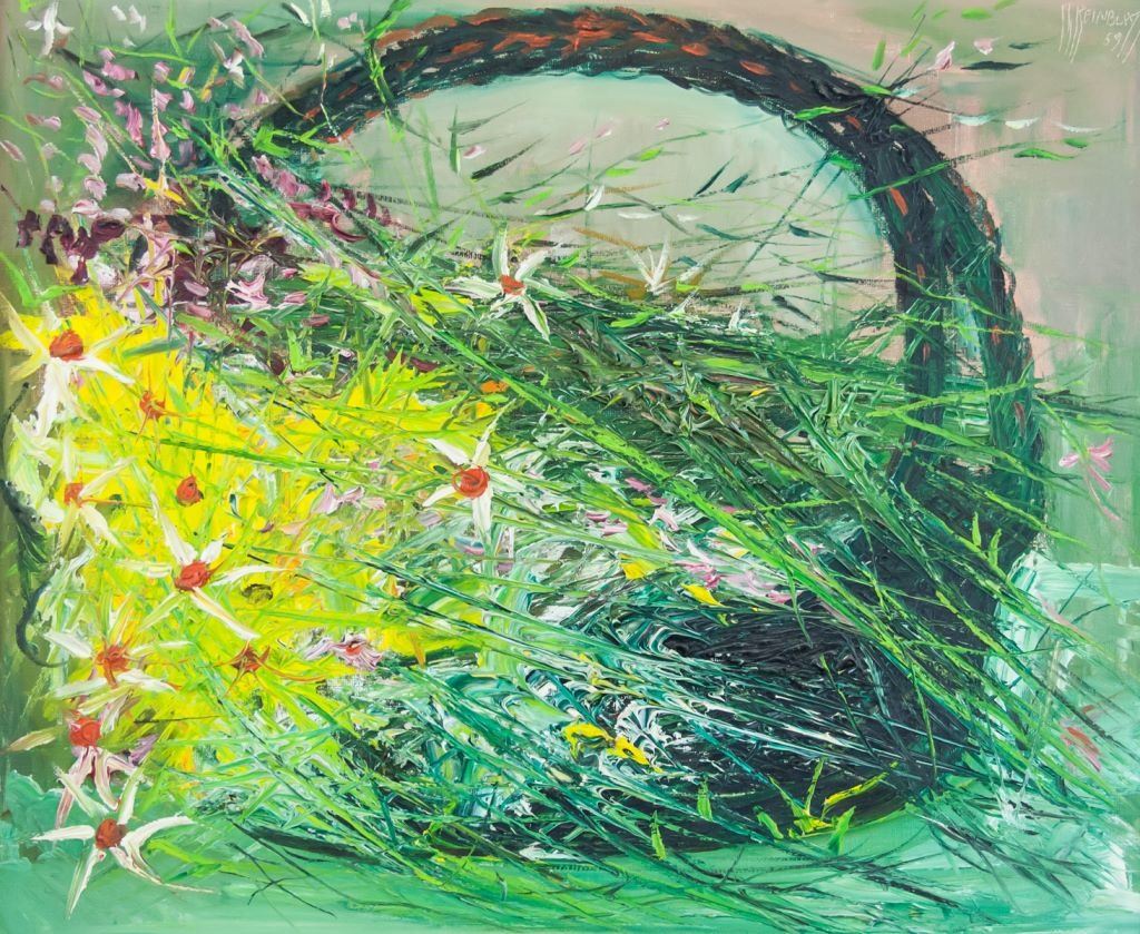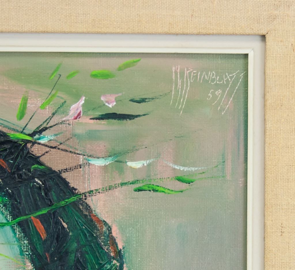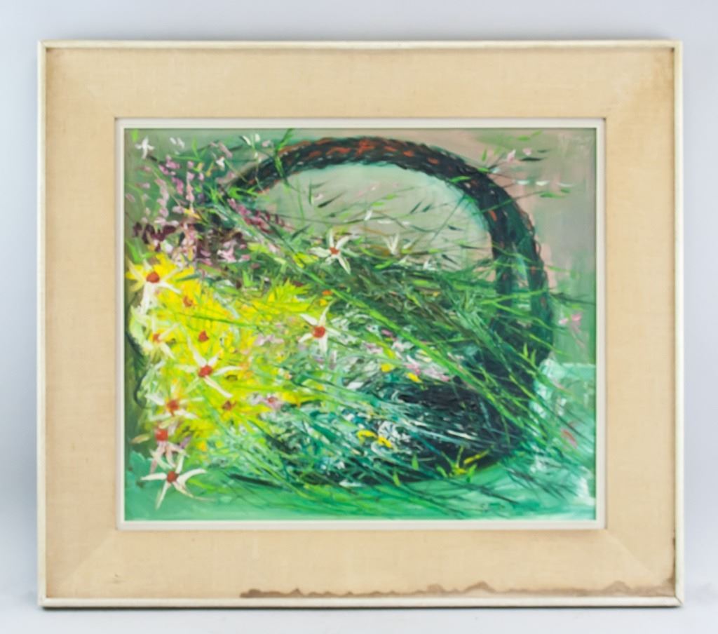 Oil on canvas, framed. Featuring still-life of a basket of flowers. Signed "M Reinblatt" to the top right corner, with "59" inscribed beneath the signature. 50 x 59 cm (20 x 23 in).