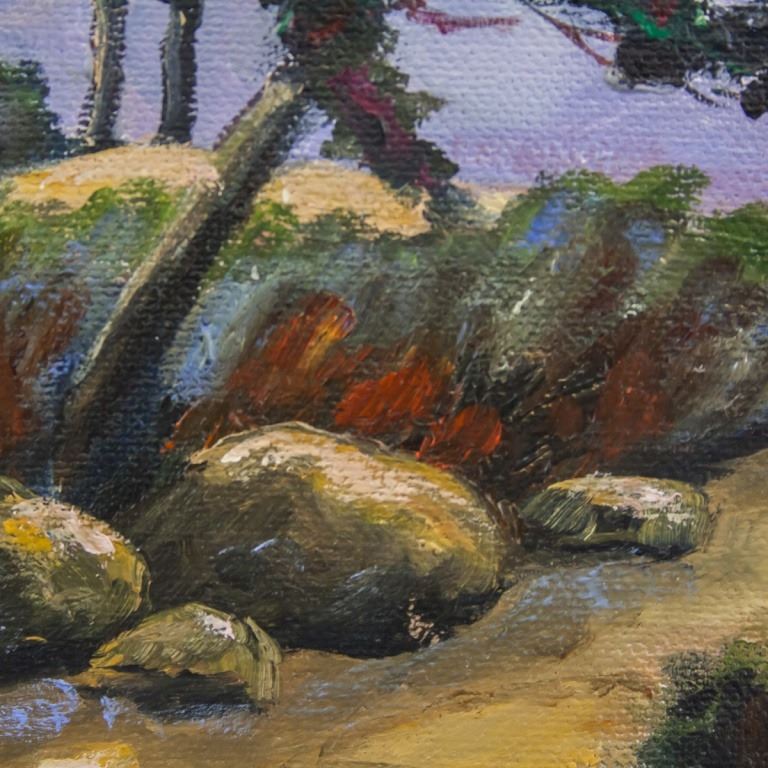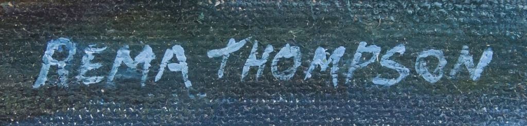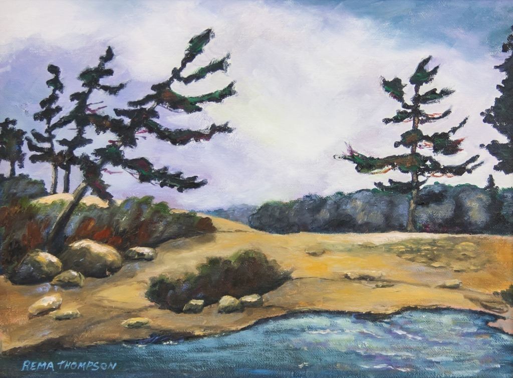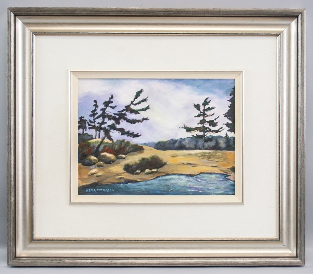 Oil on cavnas, framed. Featuring landscape in the style of the Group of Seven. Signed "REMA THOMPSON" to the bottom left. Label on verso reads "Killbear Prov. Park / Aug 2010 Trip #2 / $295". Canvas size: 21 x 29 cm (8.5 x 11.5 inches). Frame size: 48 x 55 cm (19 x 22 inches).