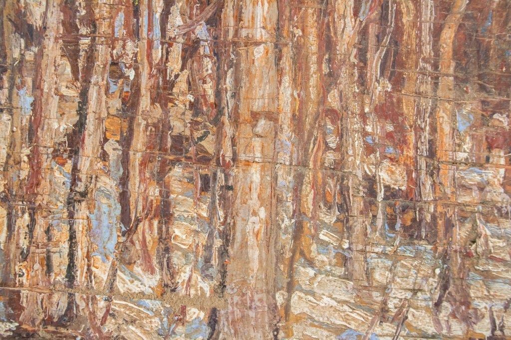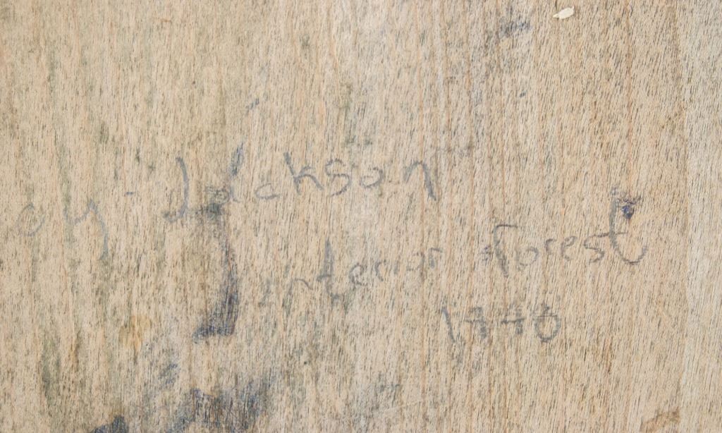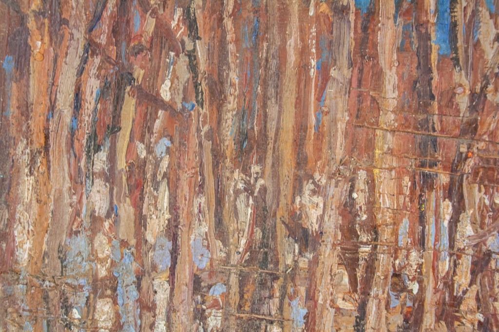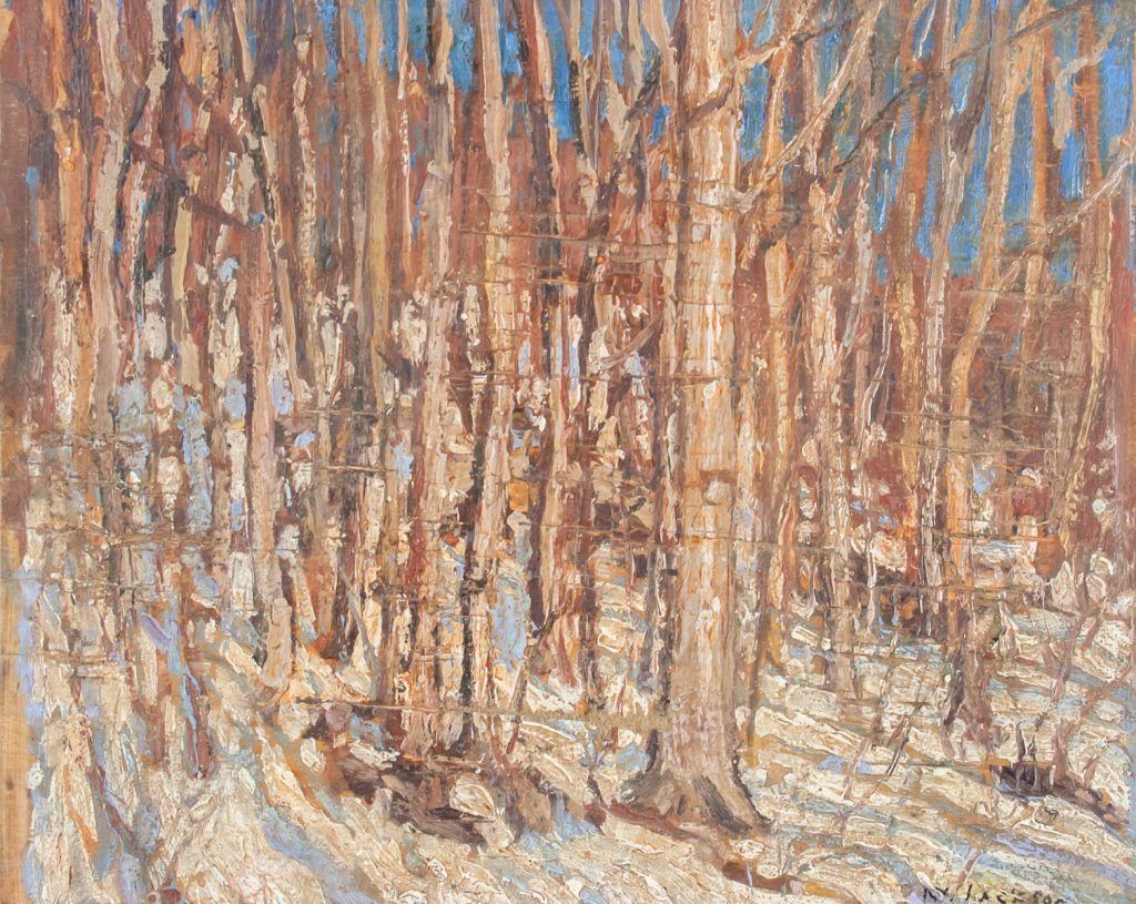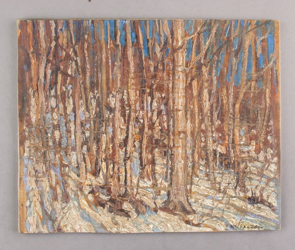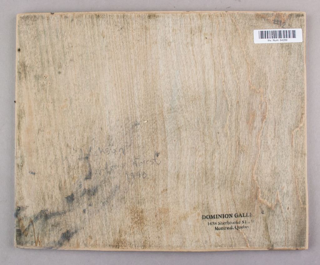 Oil on panel. Featuring copse of trees with bare branches. Signed "AY Jackson" to the bottom right corner. Stamp on verso reads "DOMINION GALLERY / 1438 Sherbrooke, Montreal, Quebec". 21.5 x 26.5 cm (8.5 x 10.5 inches).