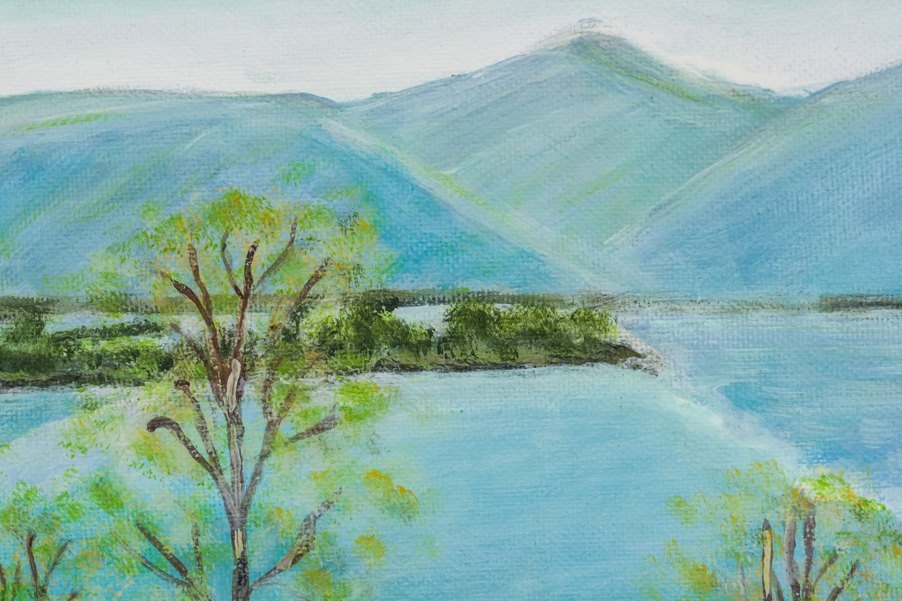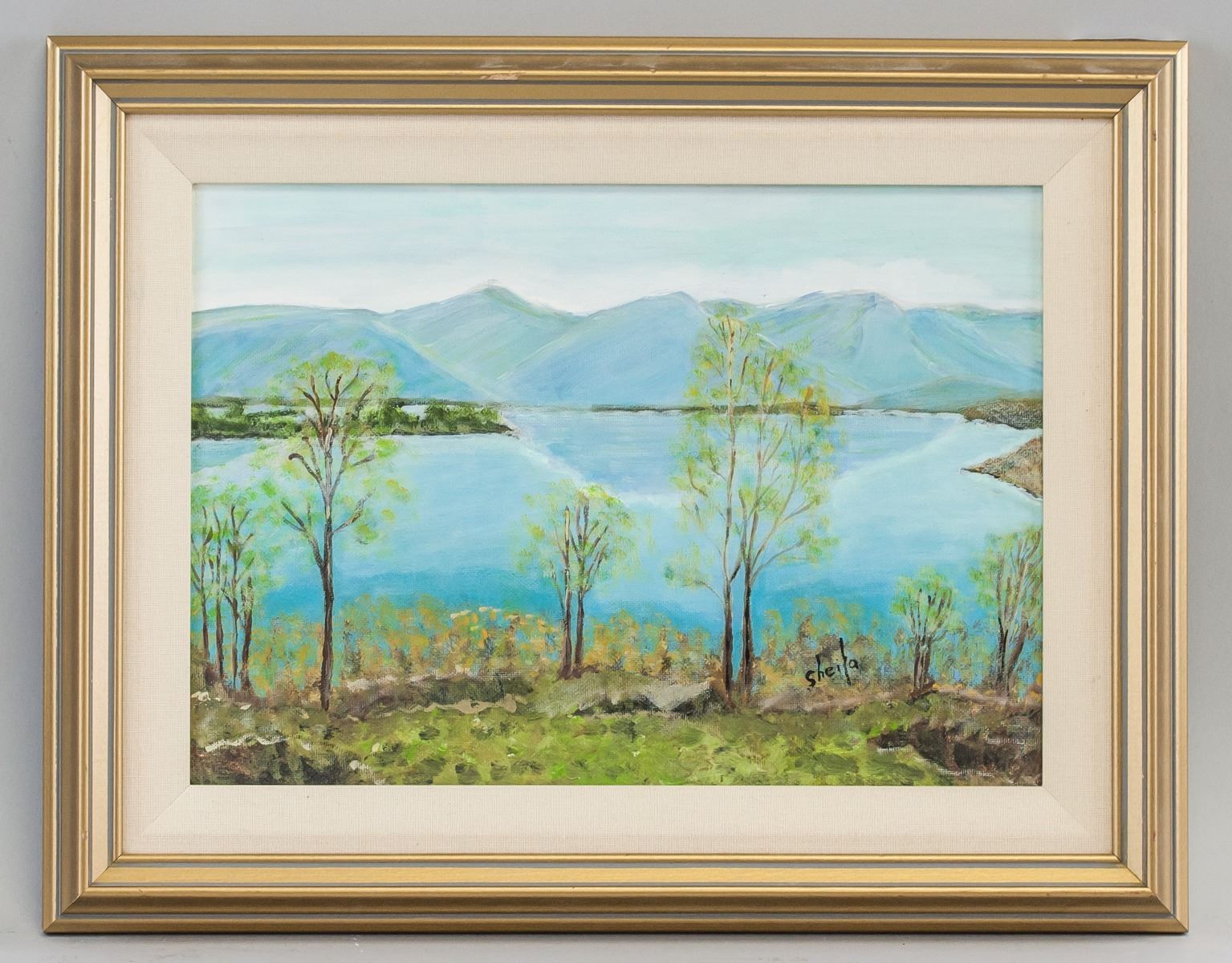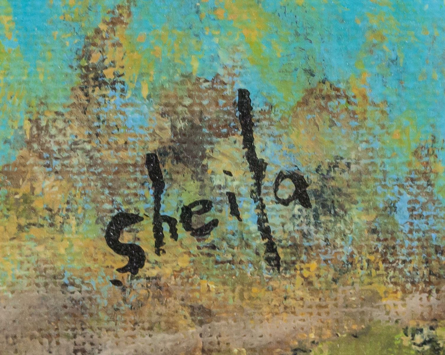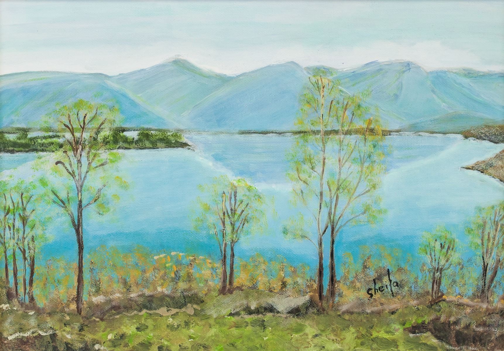 Oil on panel, framed. Featuring lake scene with mountains in the background. Signed "sheila" to the bottom right. 24 x 35 cm (9.5 x 13.5 in), Frame: 36 x 46.5 cm (15.25 x 18.5 in).