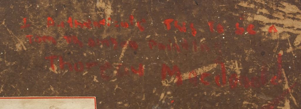 Oil on panel, framed. Featuring landscape scene. "Tom Thomson" signed to the bottom right corner. Label on verso reads "TOM THOMSON 1915 ALGONQUIN PARK". Second label on verso reads "Kastel Gallery Inc. / TITLE ALGONQUIN PARK / ARTIST TOM THOMSON / STOCK No OOHB6K / HEIGHT 7 / WIDTH 9 / MEDIA OIL / DATE 1915". "I authenticate this to be a Tom Thomson painting Thoreau Macdonald" inscribed on verso. "1915 ALGONQUIN PARK" inscribed on verso. "Given to me by Tom himself in 1915 Elizabeth Gardner" inscribed on stretcher bar. 17 x 22 cm, 6 3/4" x 8 1/4", F: 21 x 26 cm, 8 1/4" x 10 1/4".