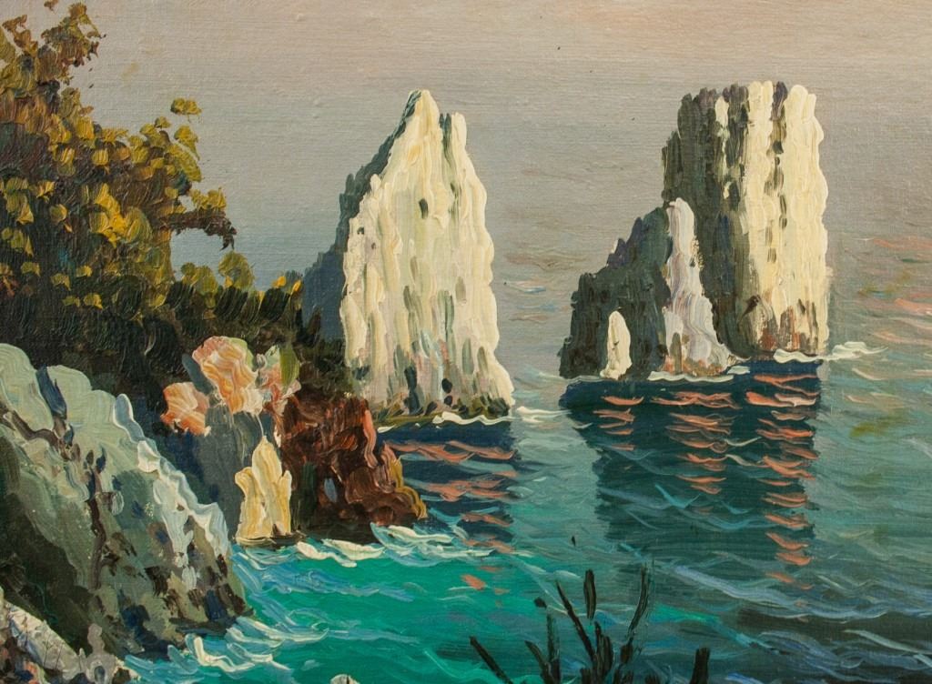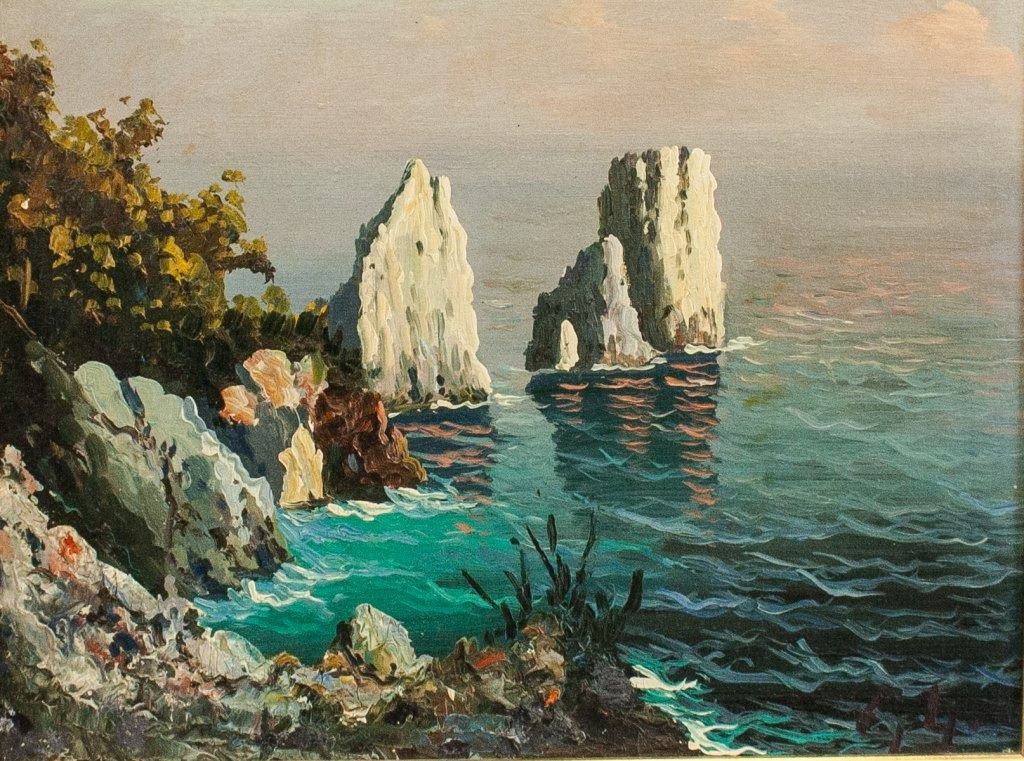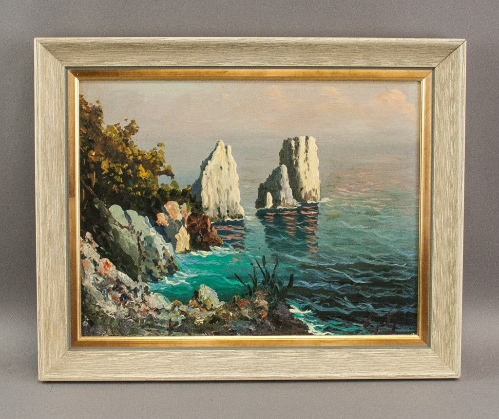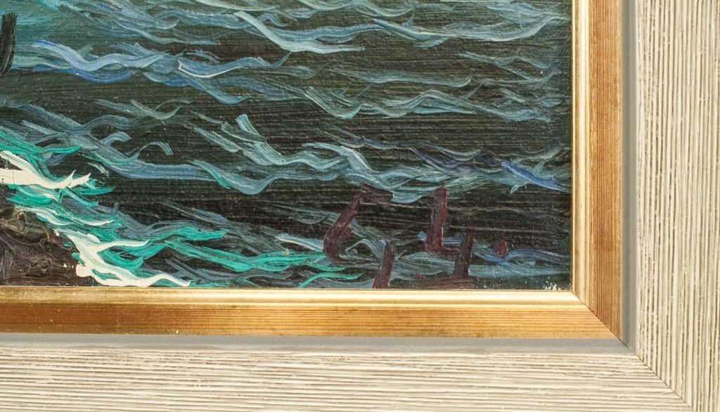 Oil on panel, framed. Featuring a landscape maritime scene. Signed or inscribed G4 on the lower right corner. Panel size: 28 x 34 cm (11 x 13 inches). Frame size: 35 x 44 cm (13.7 x 17.2 inches)